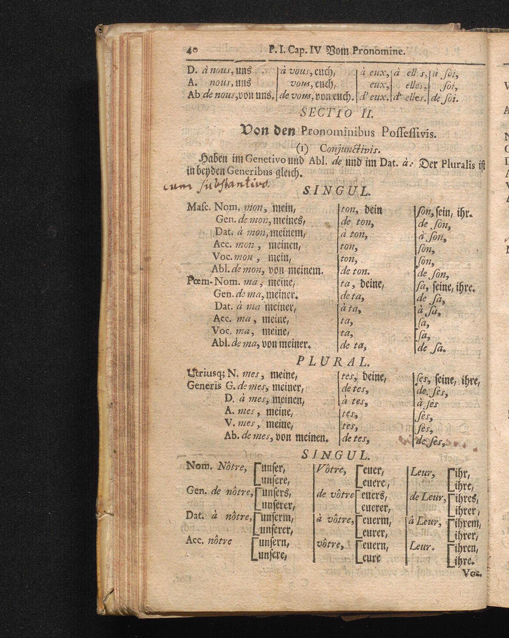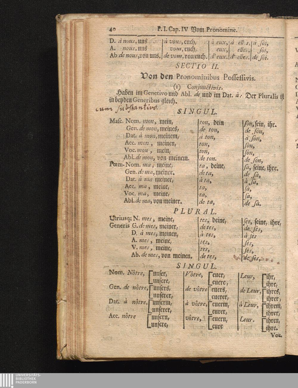 La Parfaite Grammaire Royale Françoise & Allemande, Das ist: Vollkomene Königl. Frantz. Teutsche Grammatica, : Mit neuen und sehr nützlichen Reguln, Nebst einem verbesserten Wörter-Buche, manierlichen Gesprächen und zierlichen Redens Arten, auserlesenen Sprüchen, artigen Historien und sinnreichen Einfällen, anmuthigen und nach ietziger Zeit wohlgesetzen Briefen / verfasset vom Hrn. des Pepliers, Acad. Mitgliede