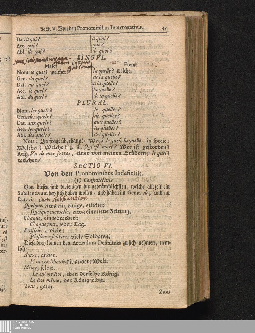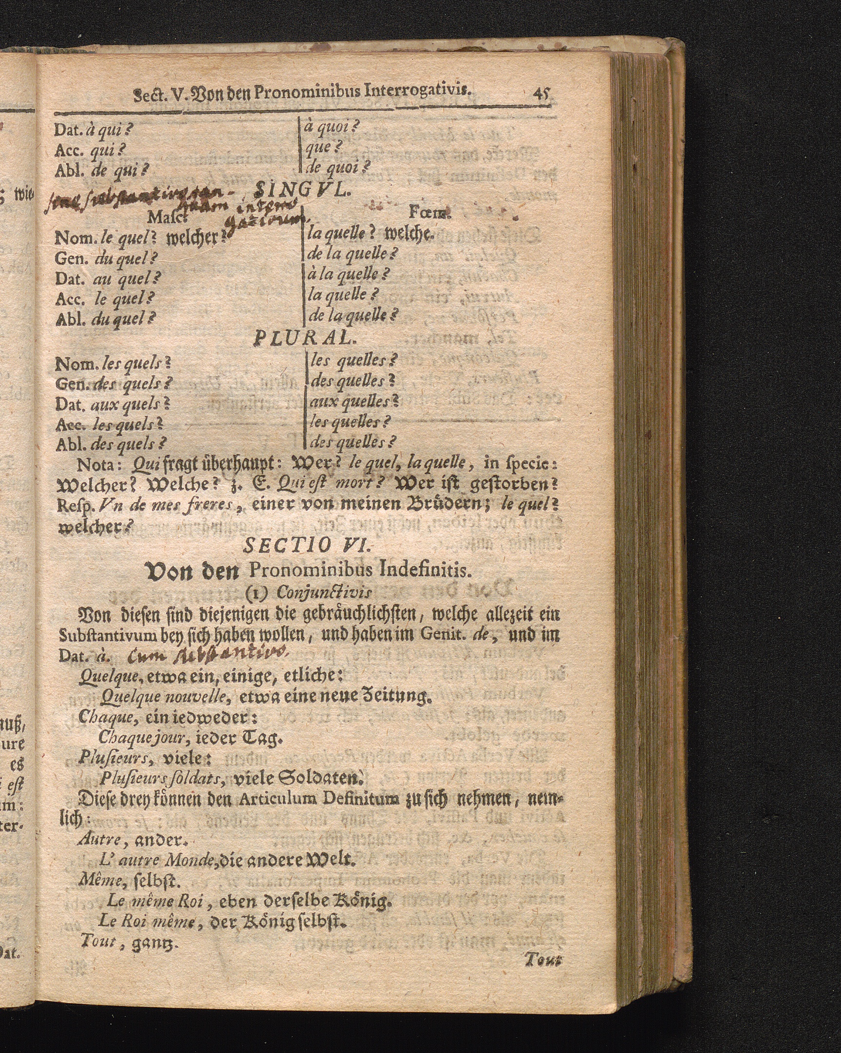 La Parfaite Grammaire Royale Françoise & Allemande, Das ist: Vollkomene Königl. Frantz. Teutsche Grammatica, : Mit neuen und sehr nützlichen Reguln, Nebst einem verbesserten Wörter-Buche, manierlichen Gesprächen und zierlichen Redens Arten, auserlesenen Sprüchen, artigen Historien und sinnreichen Einfällen, anmuthigen und nach ietziger Zeit wohlgesetzen Briefen / verfasset vom Hrn. des Pepliers, Acad. Mitgliede