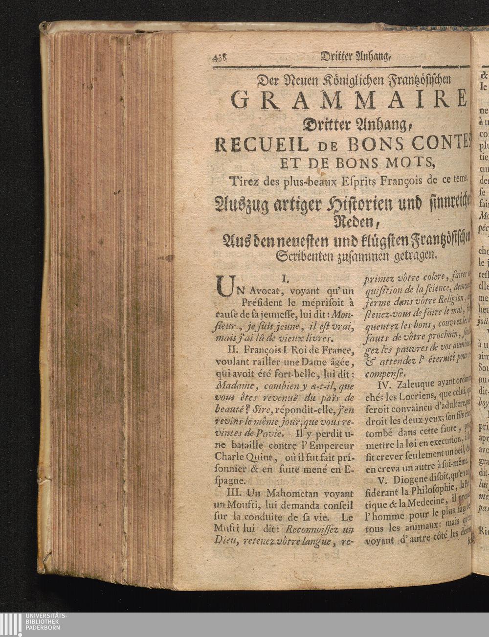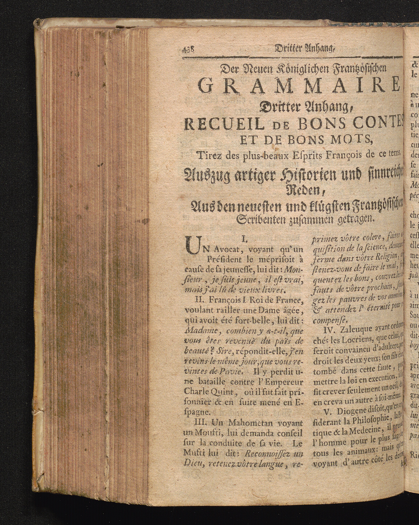 La Parfaite Grammaire Royale Françoise & Allemande, Das ist: Vollkomene Königl. Frantz. Teutsche Grammatica, : Mit neuen und sehr nützlichen Reguln, Nebst einem verbesserten Wörter-Buche, manierlichen Gesprächen und zierlichen Redens Arten, auserlesenen Sprüchen, artigen Historien und sinnreichen Einfällen, anmuthigen und nach ietziger Zeit wohlgesetzen Briefen / verfasset vom Hrn. des Pepliers, Acad. Mitgliede