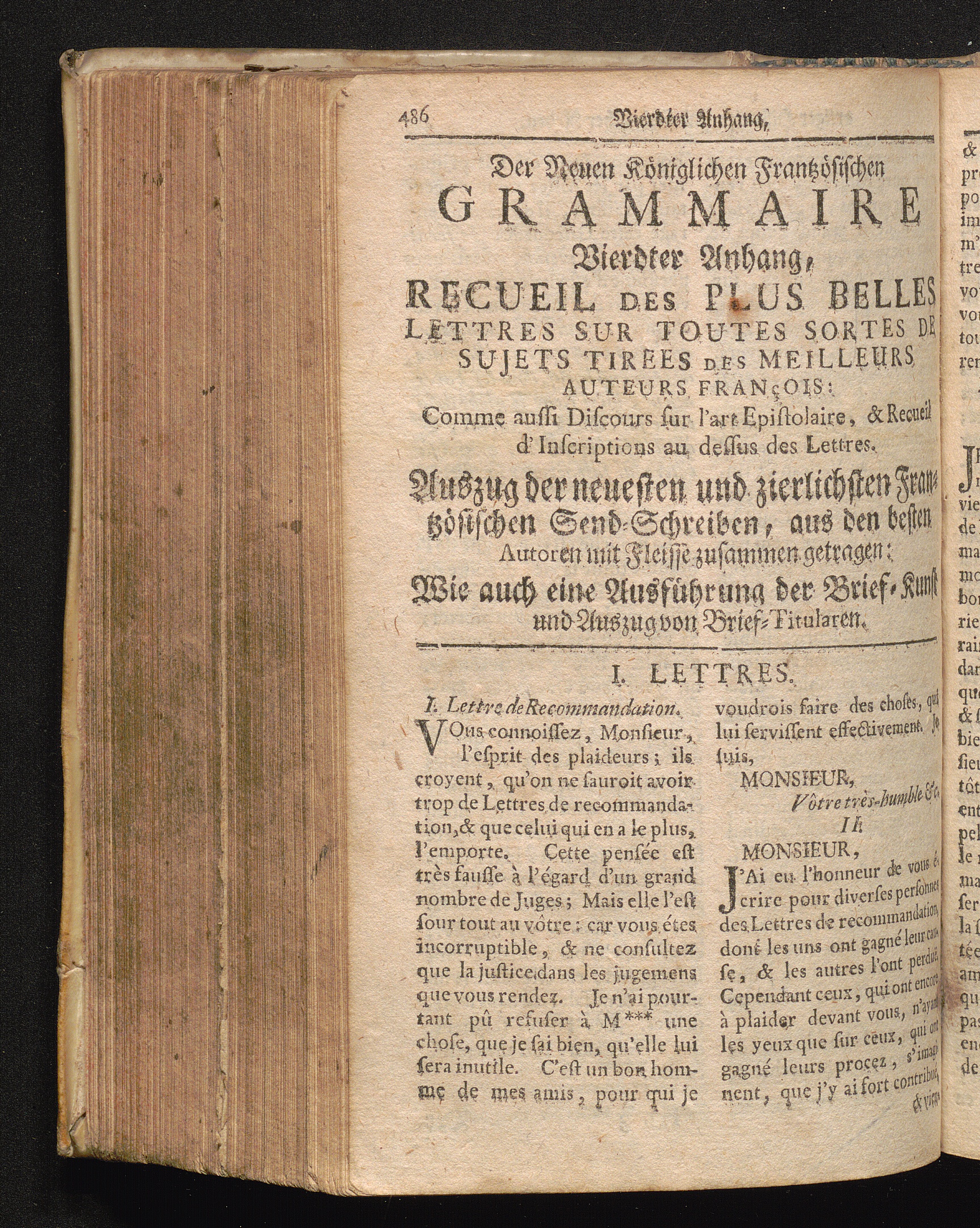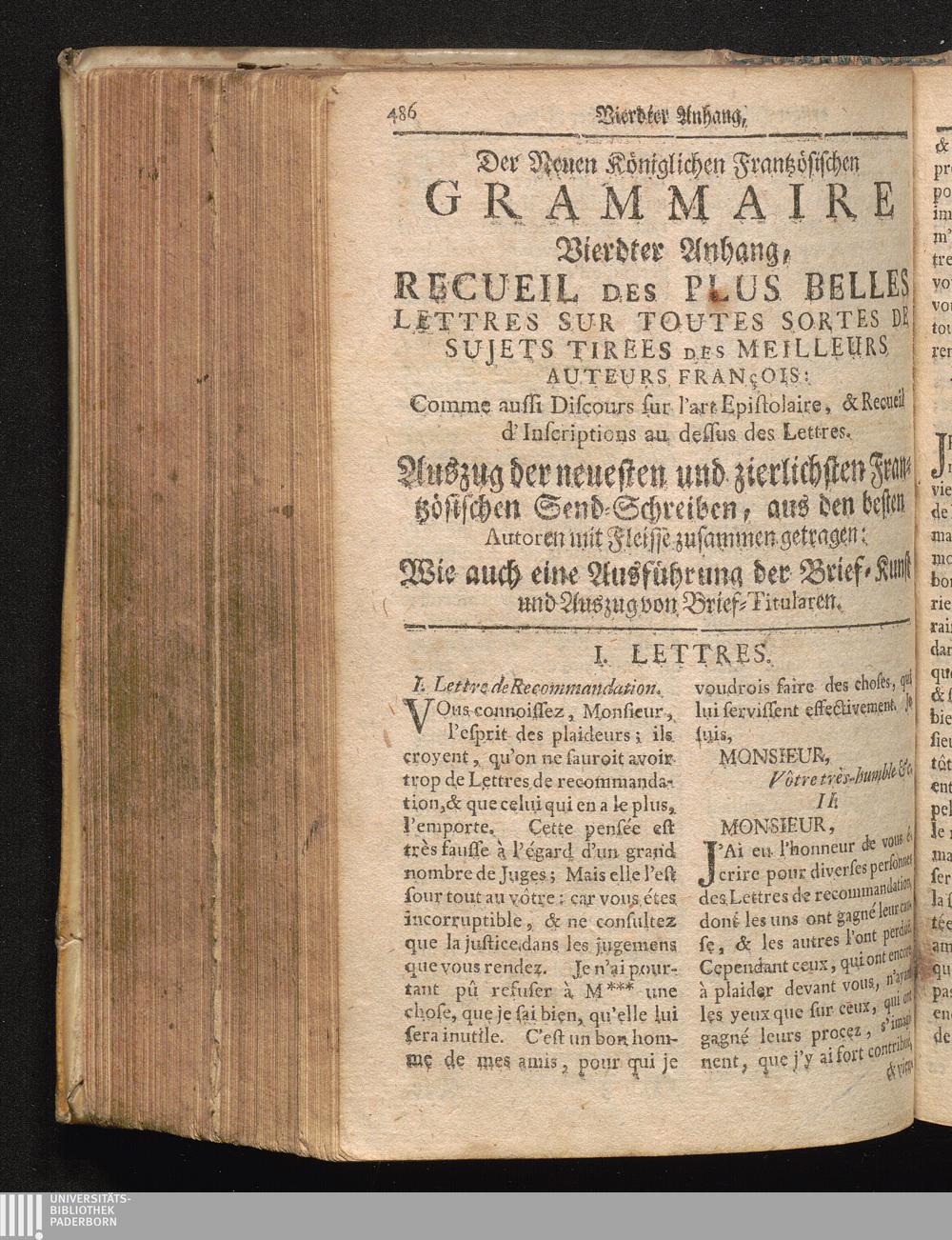 La Parfaite Grammaire Royale Françoise & Allemande, Das ist: Vollkomene Königl. Frantz. Teutsche Grammatica, : Mit neuen und sehr nützlichen Reguln, Nebst einem verbesserten Wörter-Buche, manierlichen Gesprächen und zierlichen Redens Arten, auserlesenen Sprüchen, artigen Historien und sinnreichen Einfällen, anmuthigen und nach ietziger Zeit wohlgesetzen Briefen / verfasset vom Hrn. des Pepliers, Acad. Mitgliede