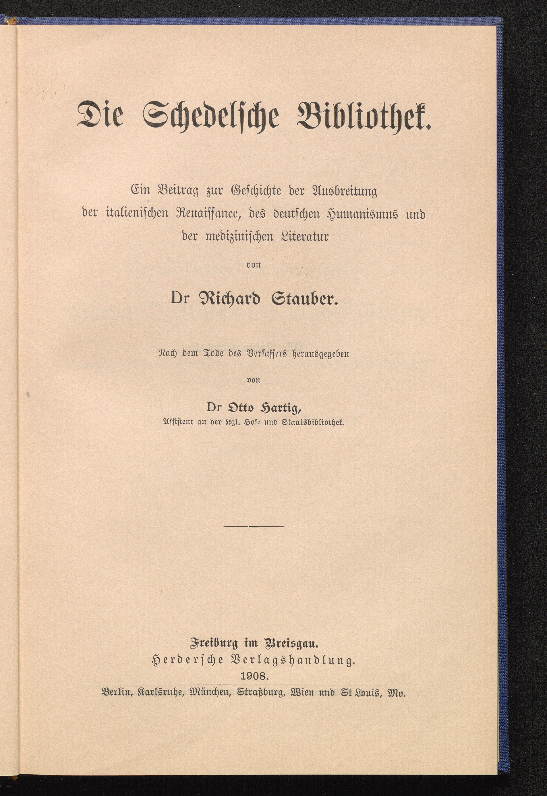 Die Schedelsche Bibliothek : ein Beitrag zur Geschichte der Ausbreitung der italienischen Renaissance, des deutschen Humanismus und der medizinischen Literatur / von Richard Stauber. Nach dem Tode des Verf. hrsg. von Otto Hartig
