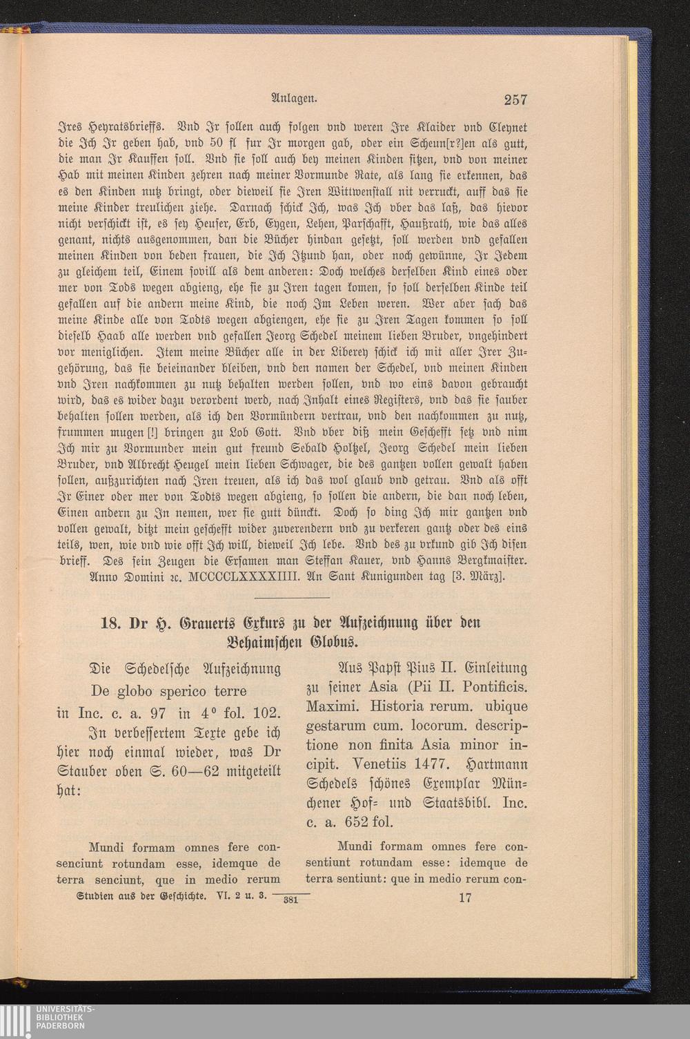 Die Schedelsche Bibliothek : ein Beitrag zur Geschichte der Ausbreitung der italienischen Renaissance, des deutschen Humanismus und der medizinischen Literatur / von Richard Stauber. Nach dem Tode des Verf. hrsg. von Otto Hartig