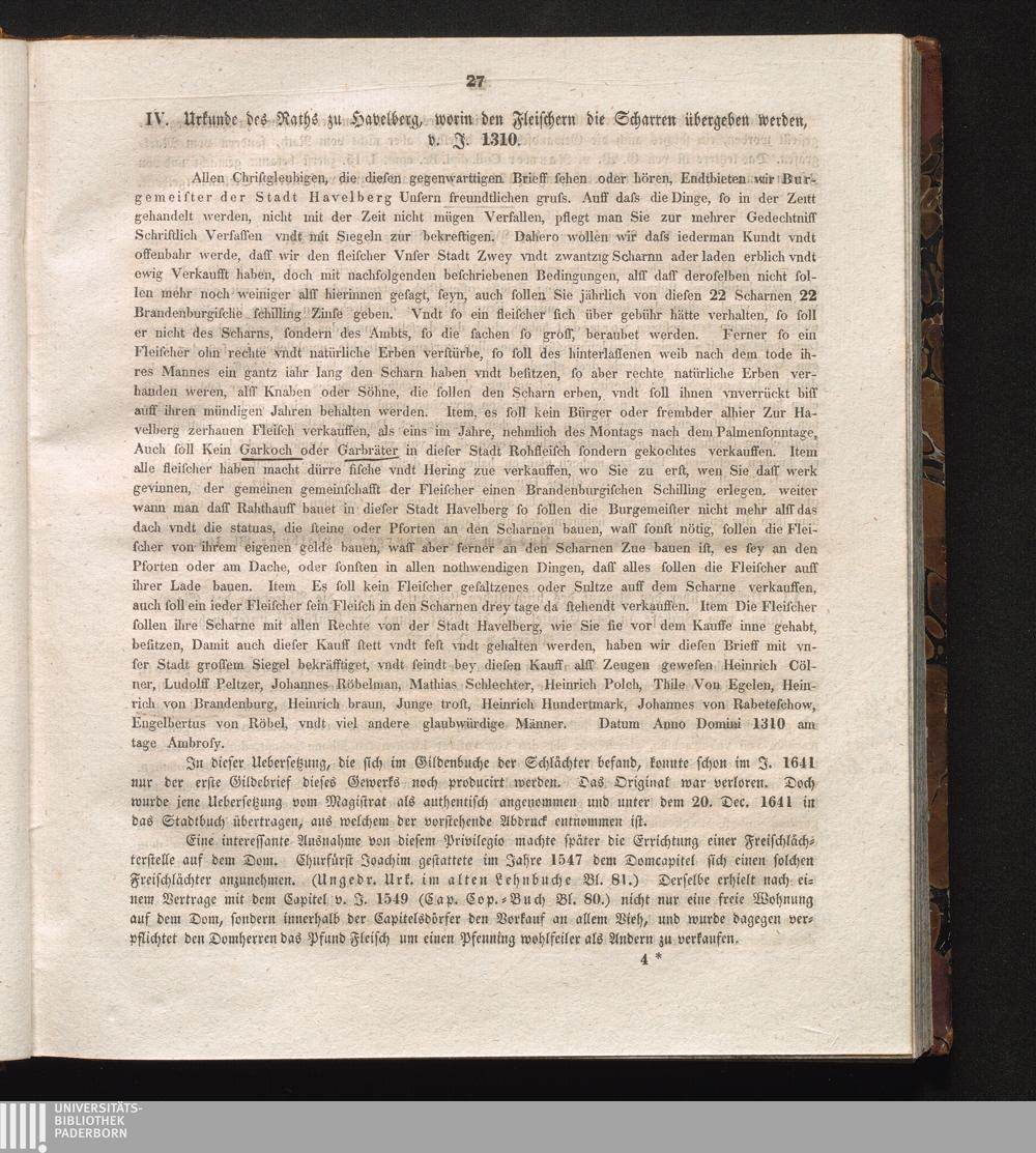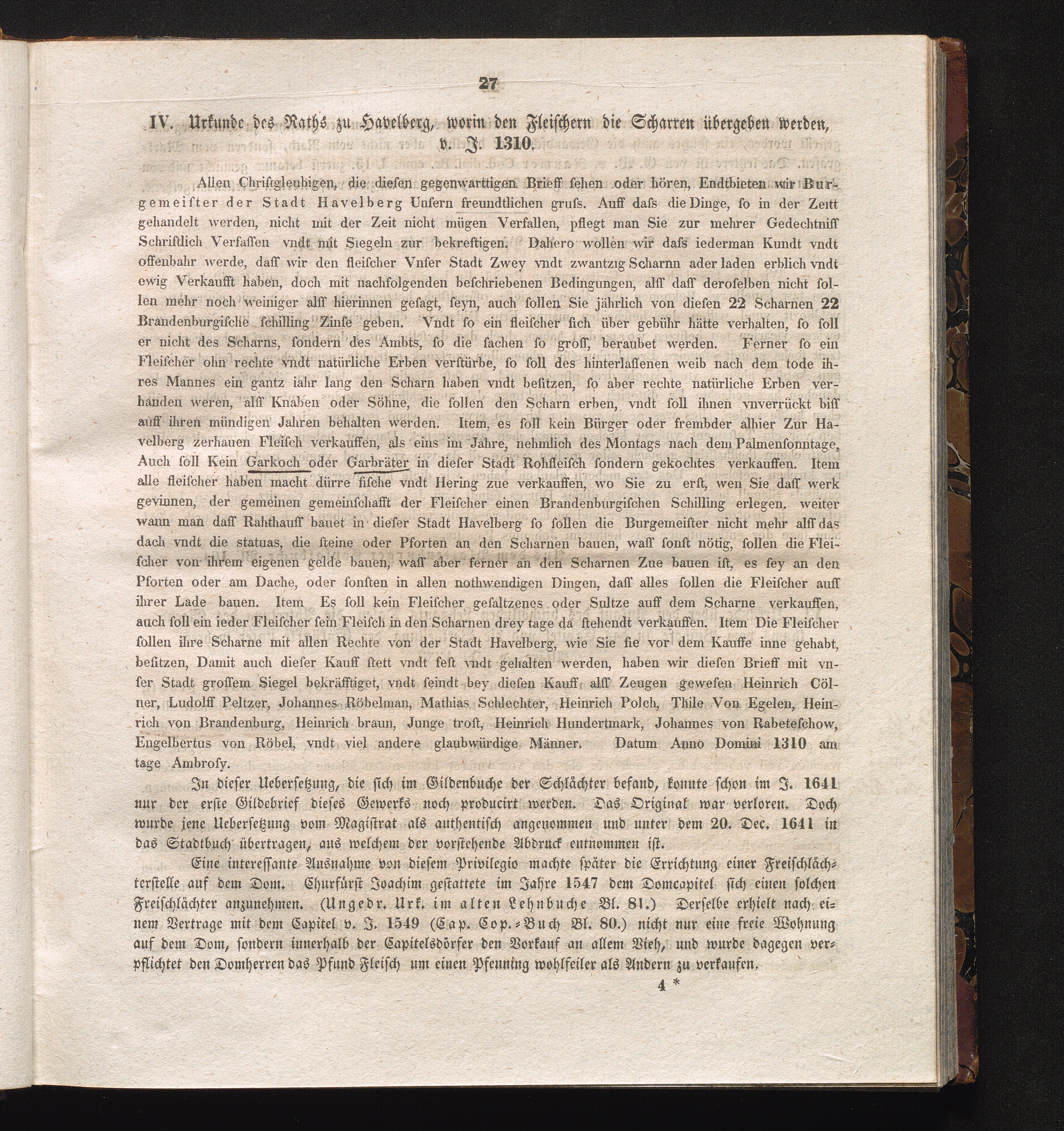 IV. Urkunde des Raths zu Havelberg, worin den Fleischern die Scharren übergeben werden,[...]