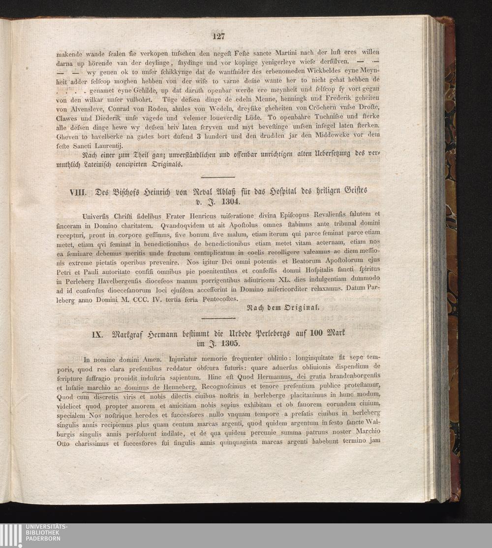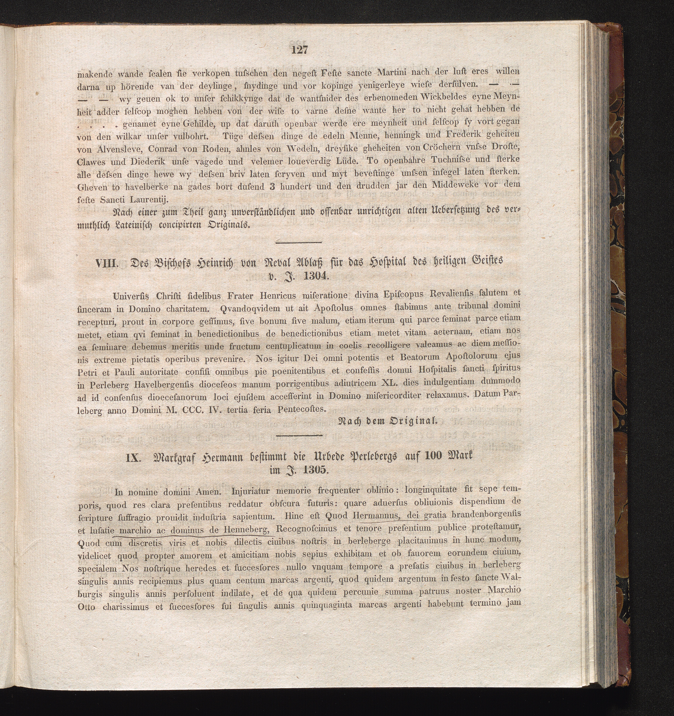 IX. Markgraf Hermann bestimmt die Urbede Perlebergs auf 100 Mark im J. 1305.
