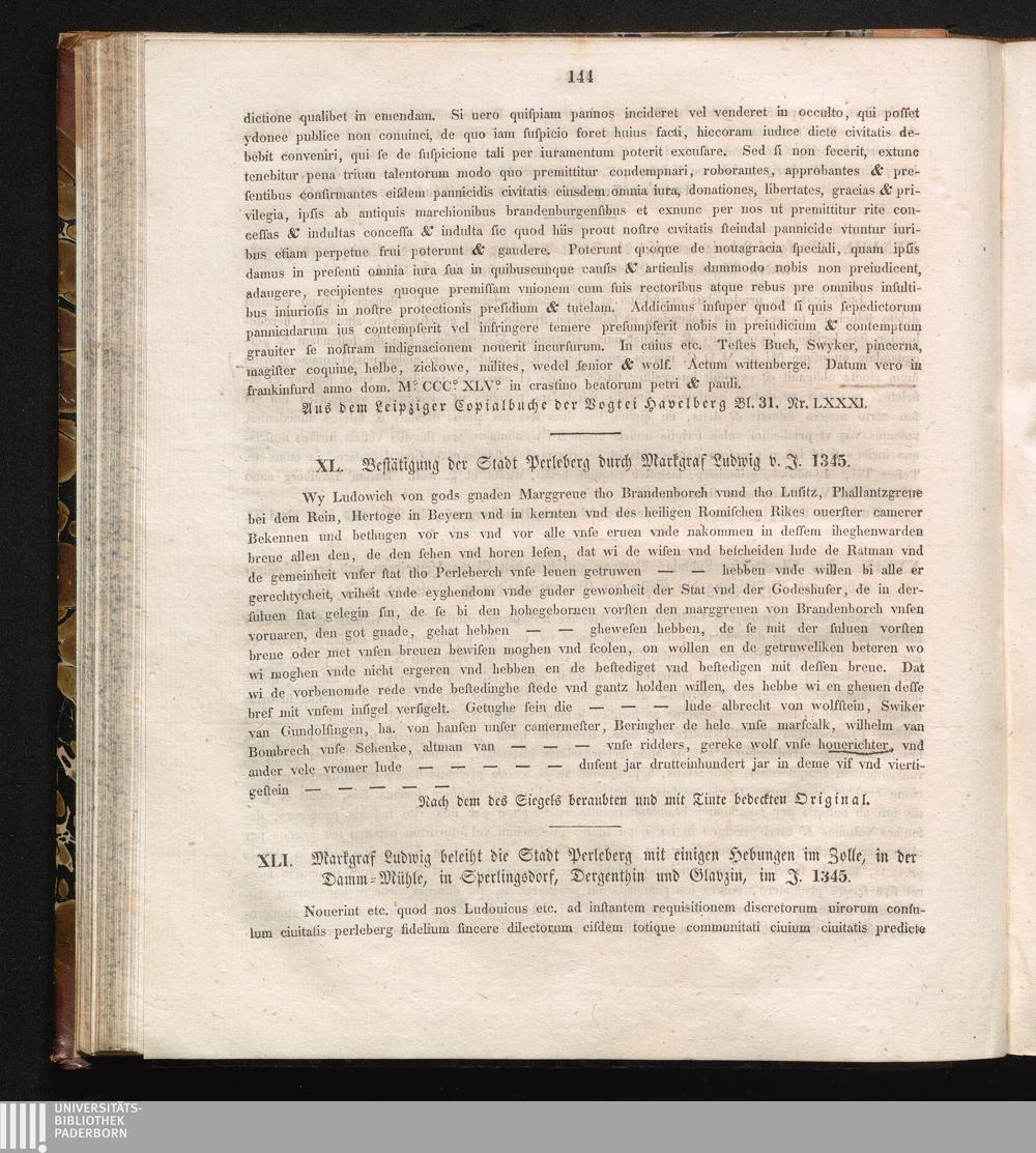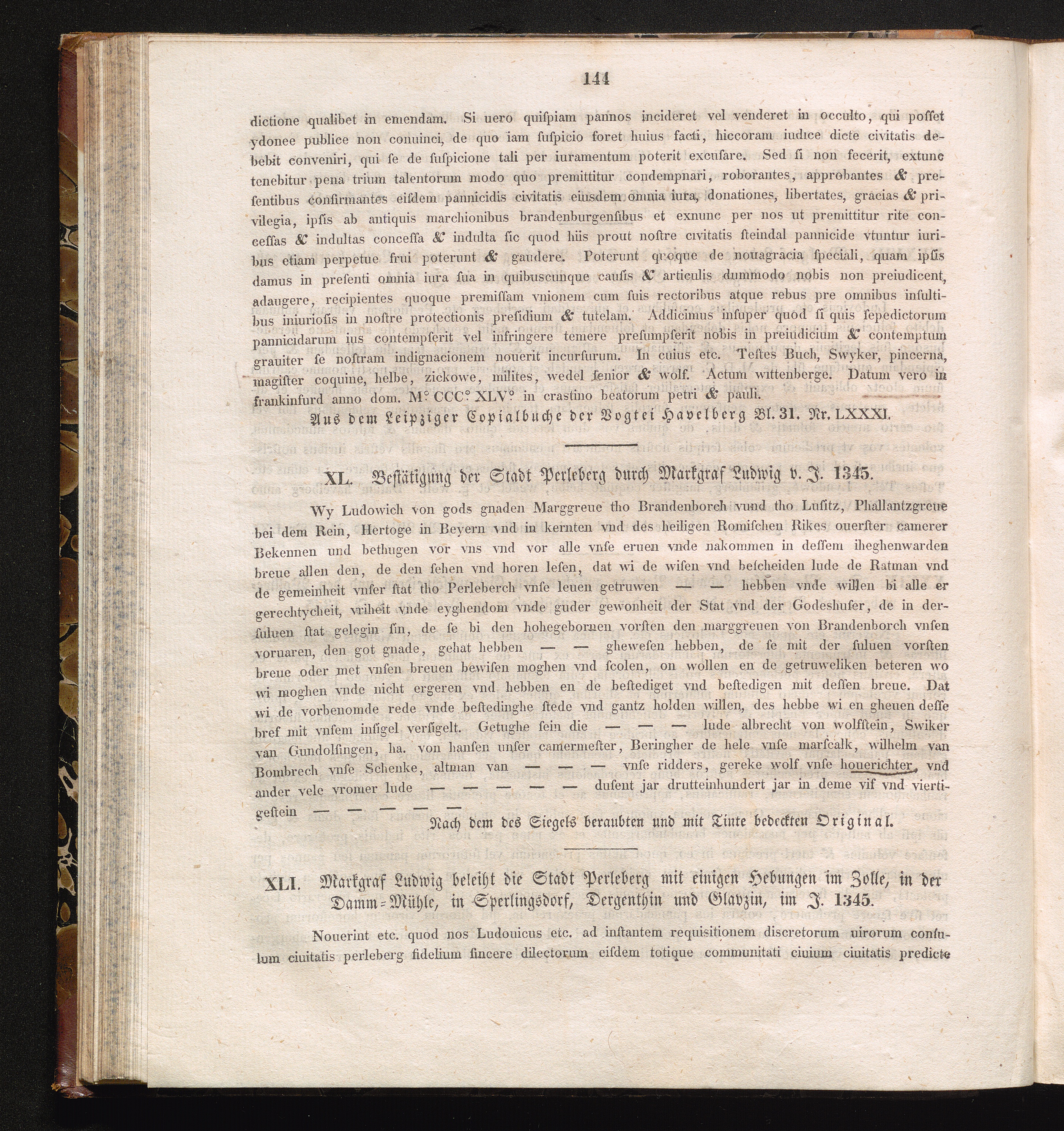 XLI. Markgraf Ludwig beleiht die Stadt Perleberg mit einigen Hebungen im Zolle, in[...]
