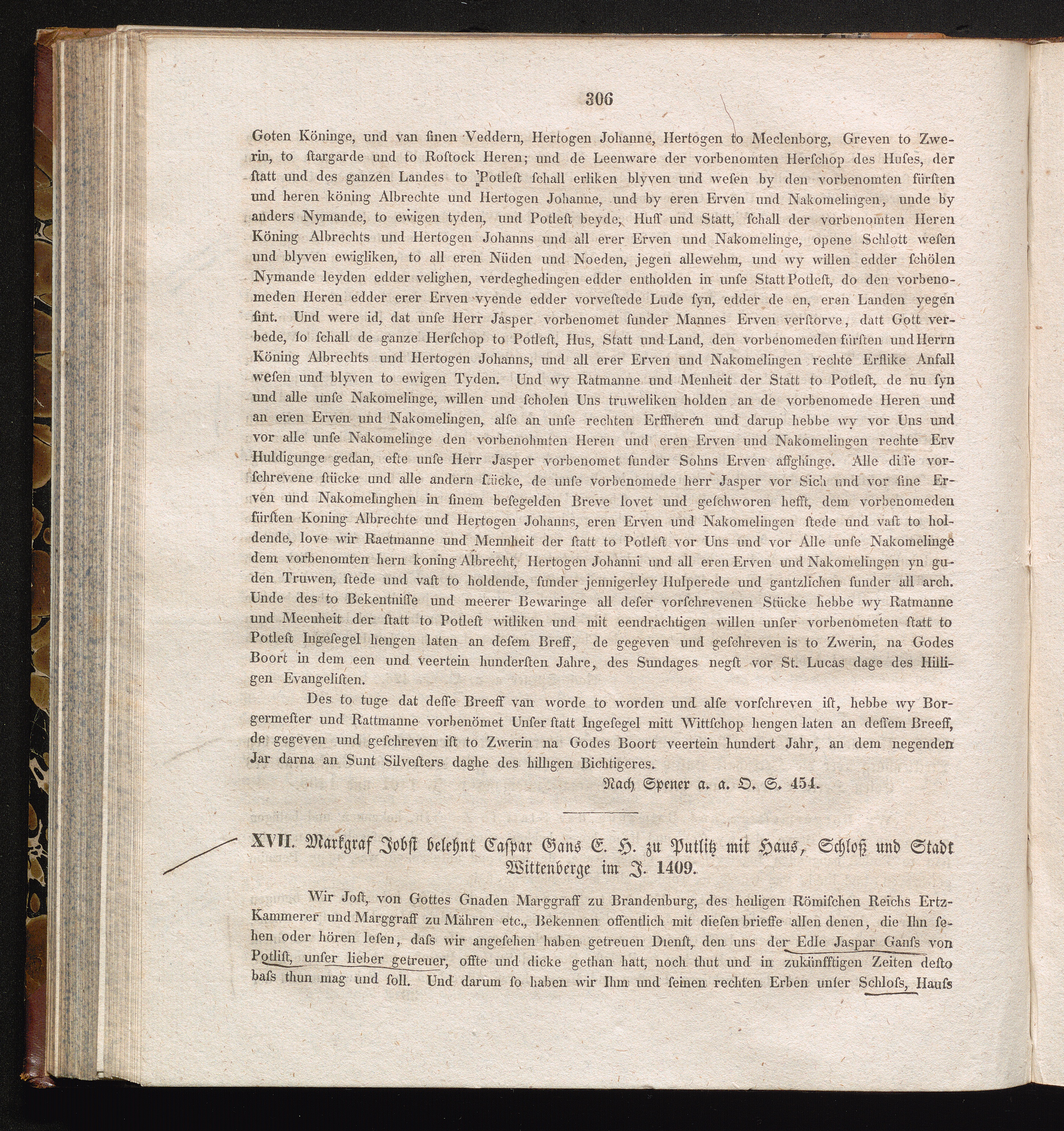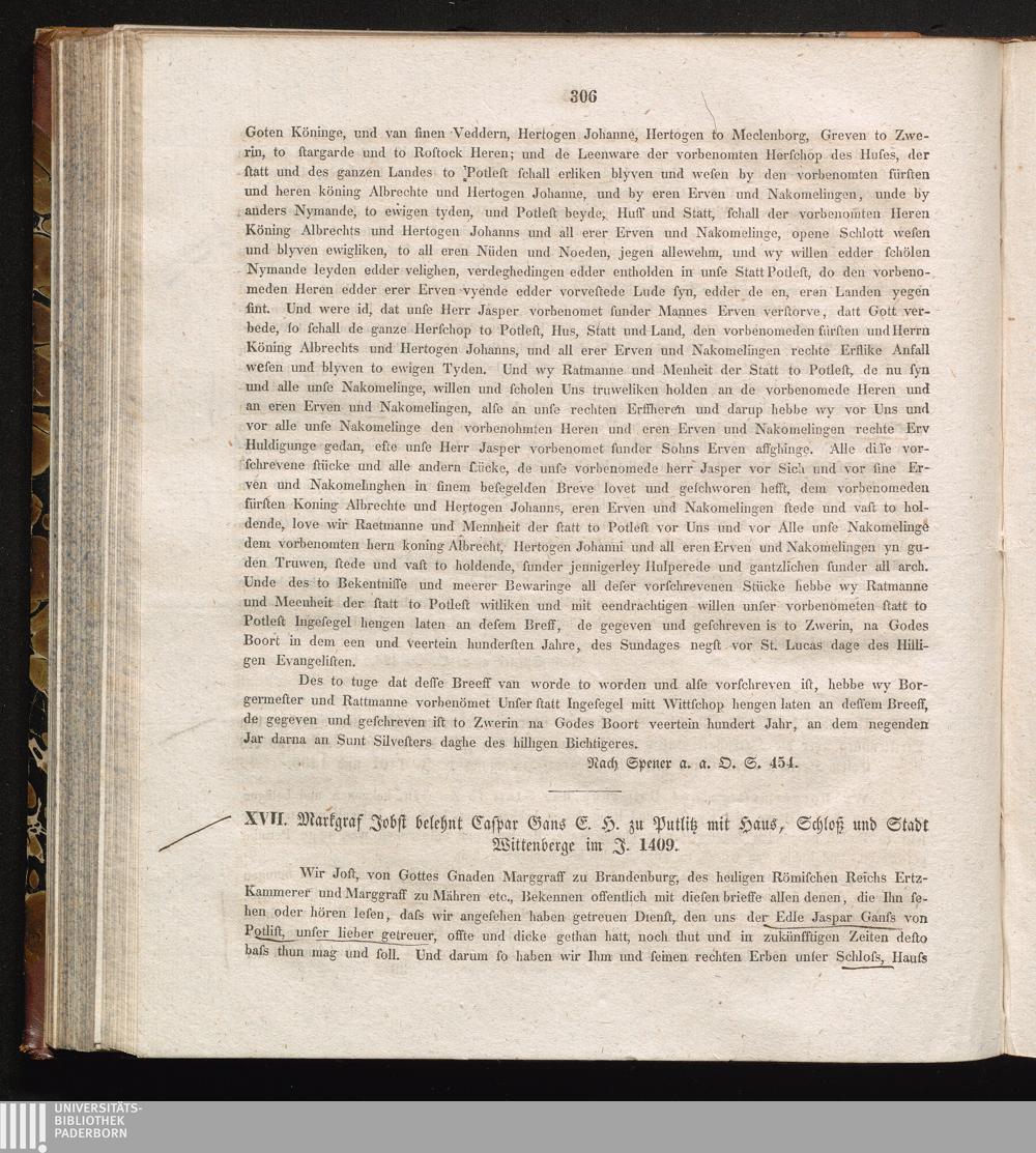 XVII. Markgraf Jobst belehnt Caspar Gans E. H. zu Putlitz mit Haus, Schloß und Stadt[...]