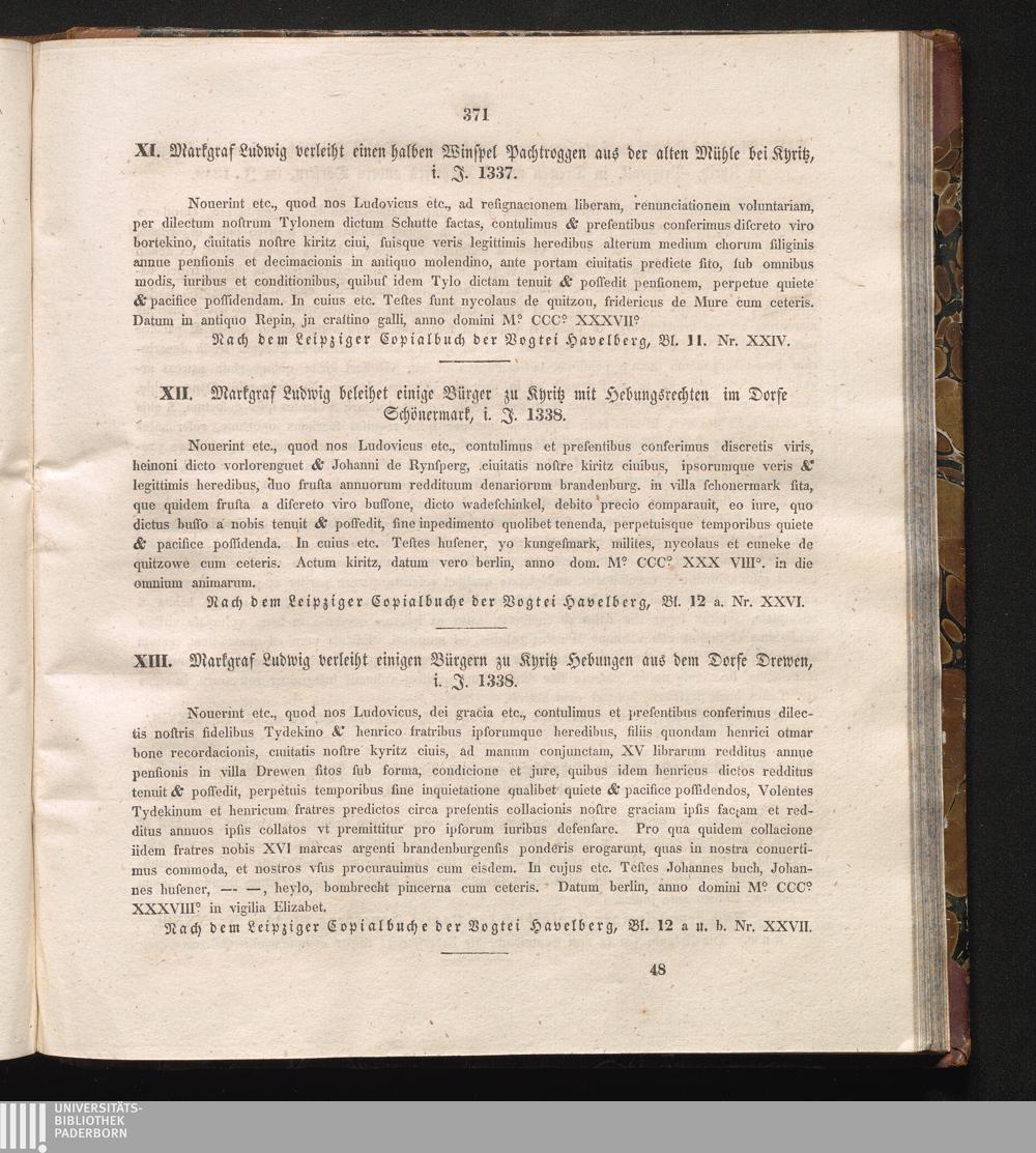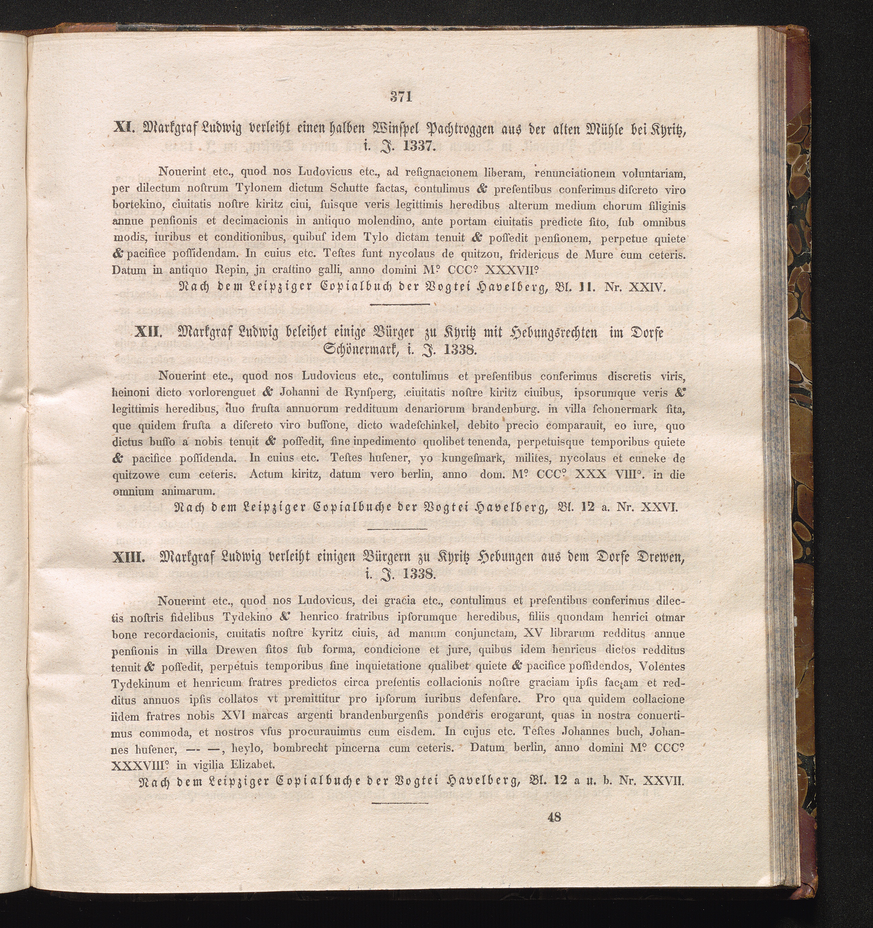 XIII. Markgraf Ludwig verleiht einigen Bürgern zu Kyritz Hebungen aus dem Dorfe Drewen,[...]