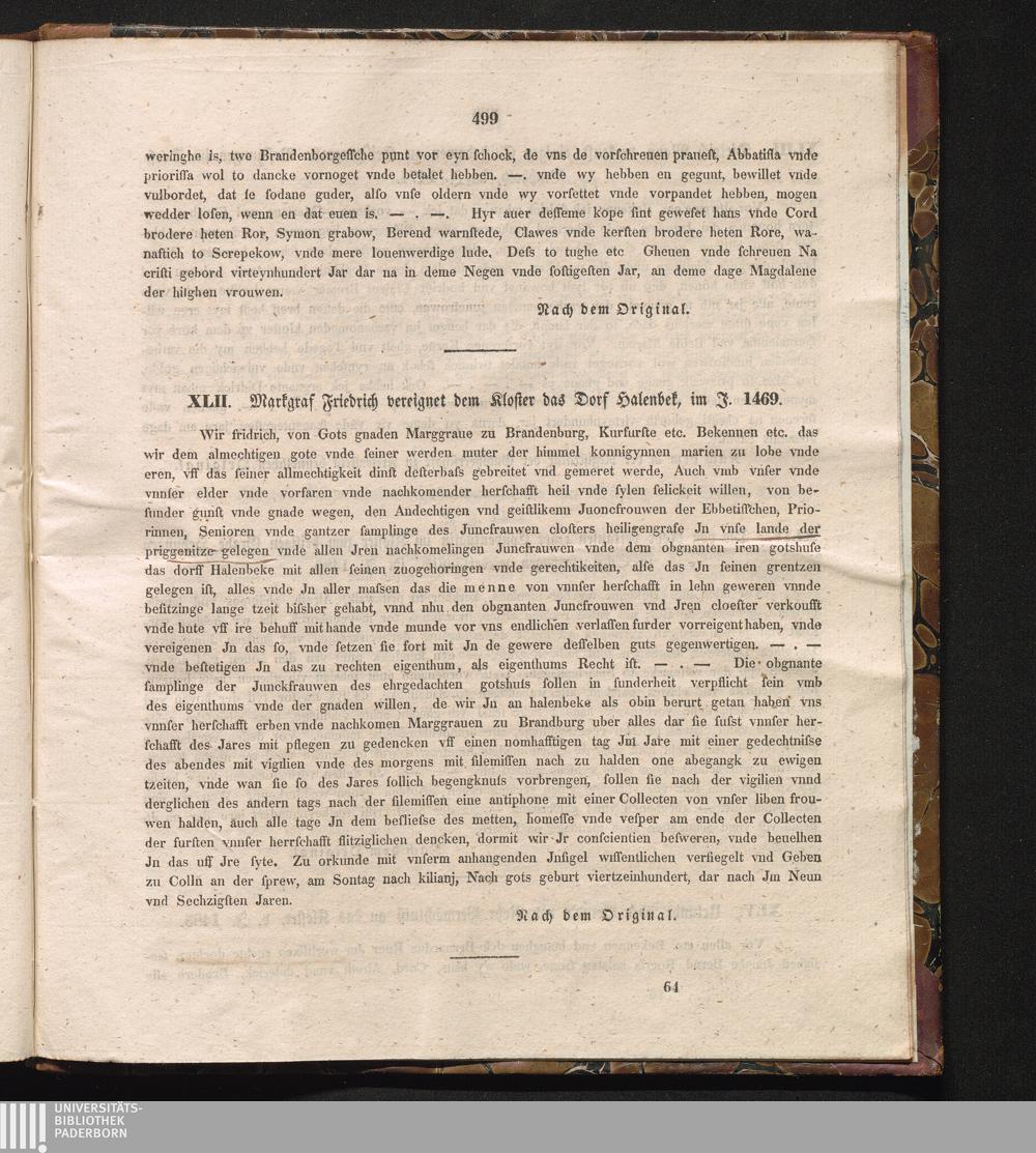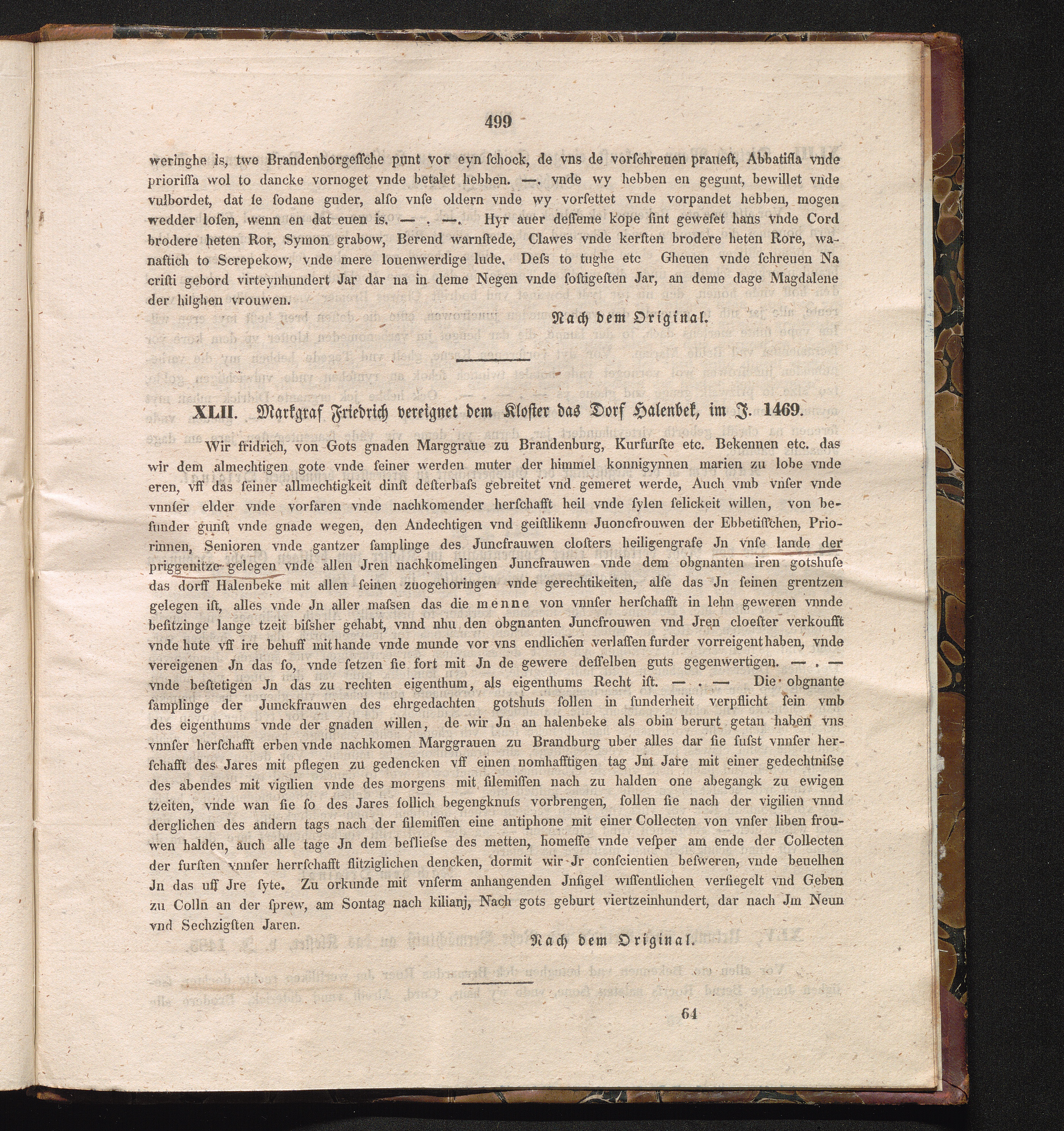 XLII. Markgraf Friedrich vereignet dem Kloster das Dorf Halenbek, im J. 1469.