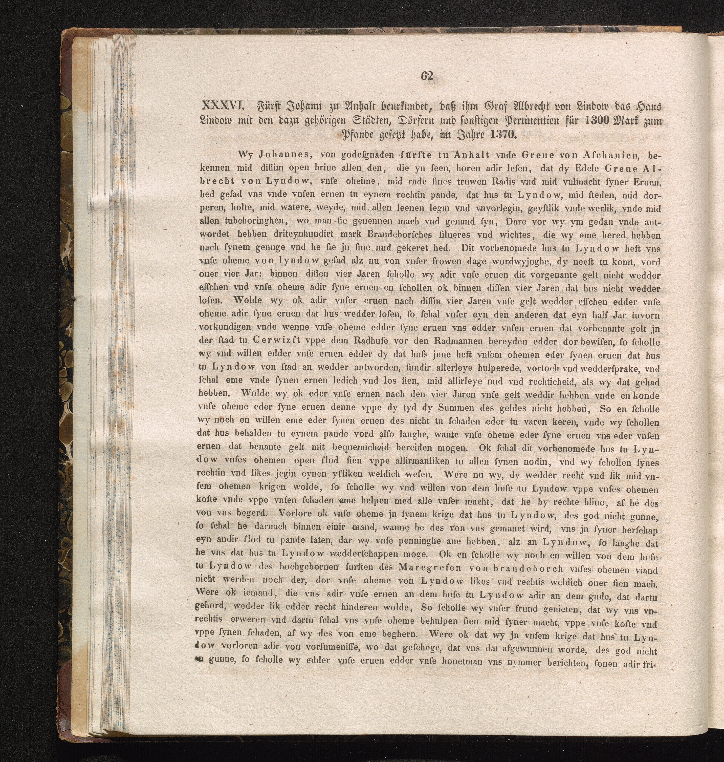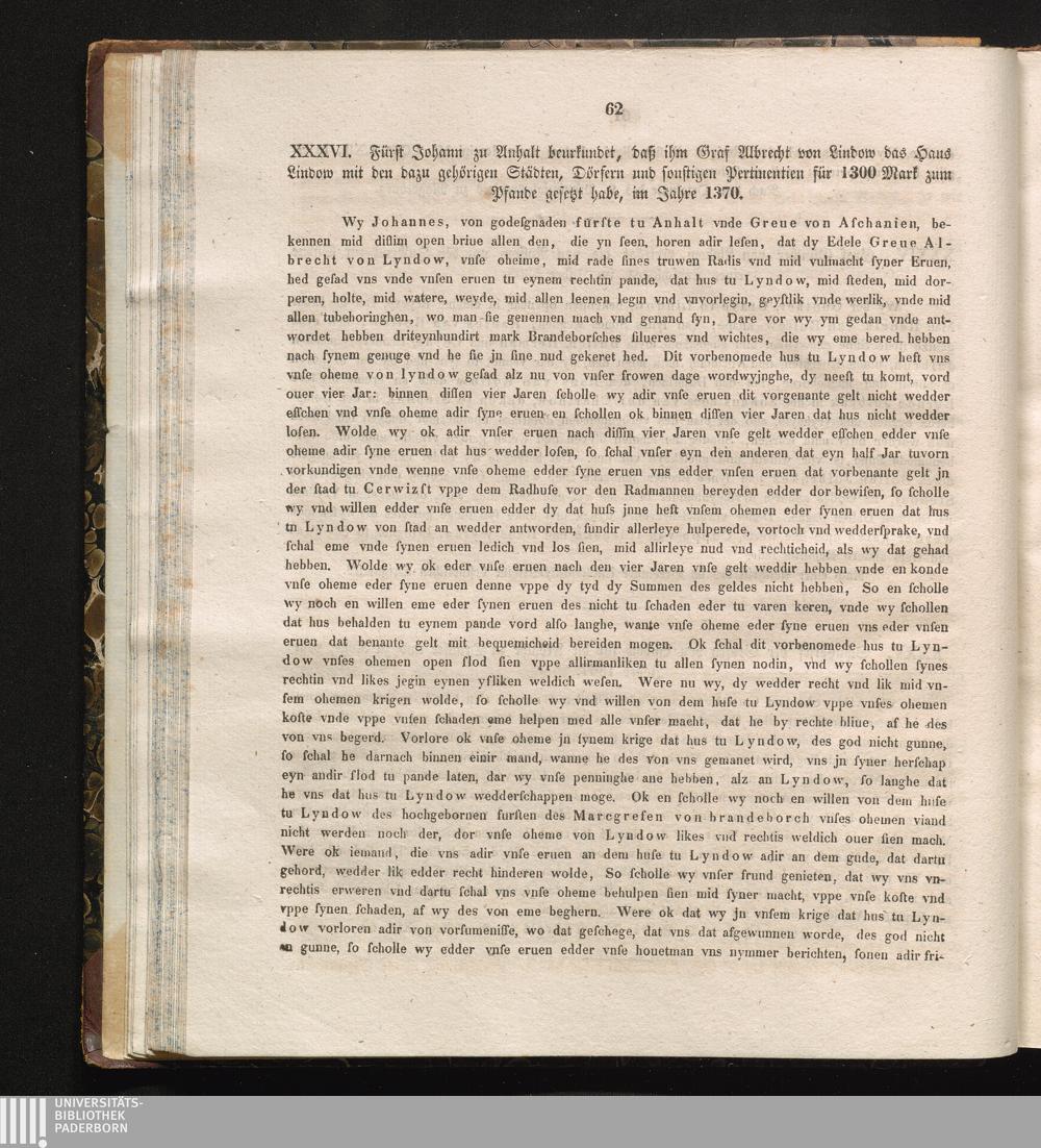 XXXVI. Fürst Johann zu Anhalt beurkundet, daß ihm Graf Albrecht von Lindow das Haus[...]