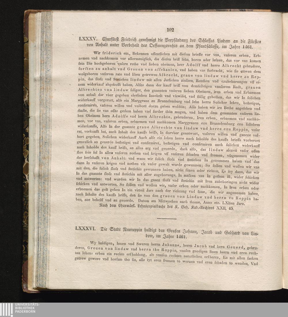 LXXXVI. Die Stadt Neuruppin huldigt den Grafen Johann, Jacob und Gebhard von Lindow,[...]