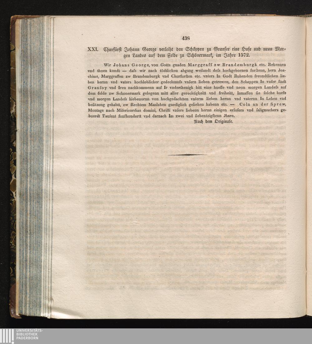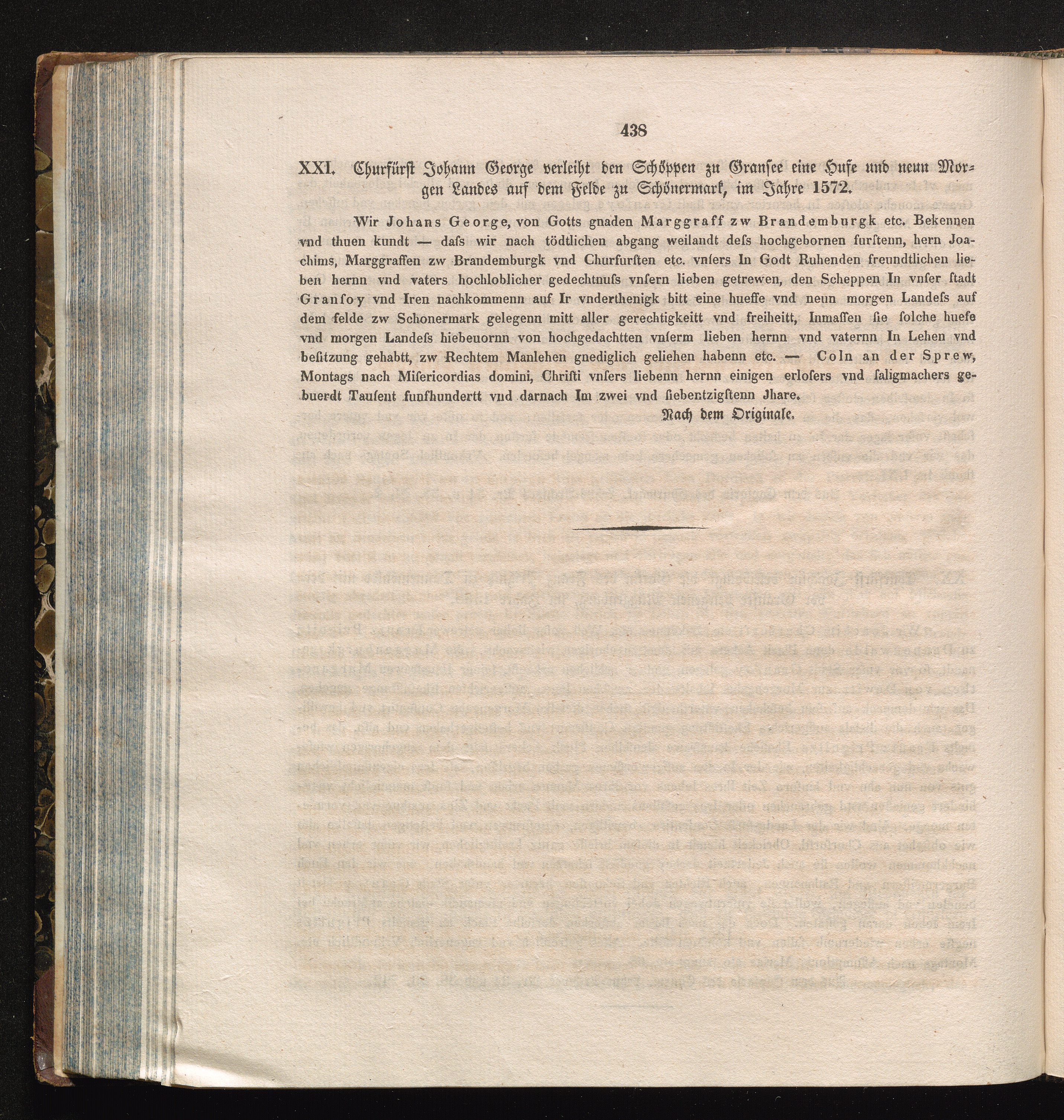 XXI. Churfürst Johann George verleiht den Schöppen zu Gransee eine Hufe und neun[...]