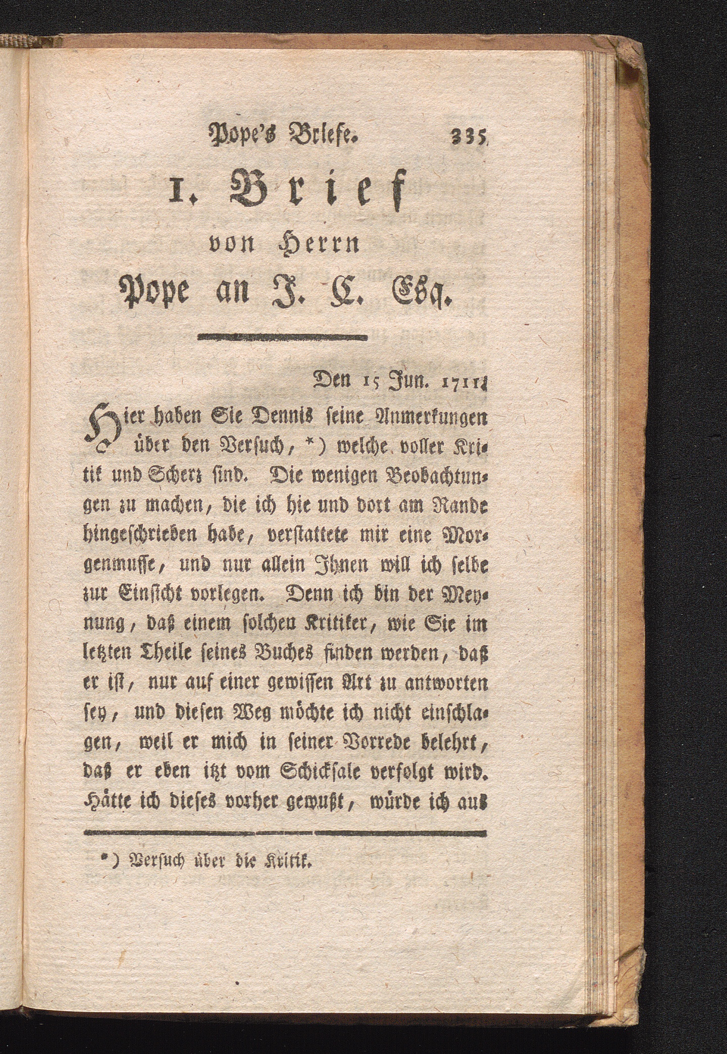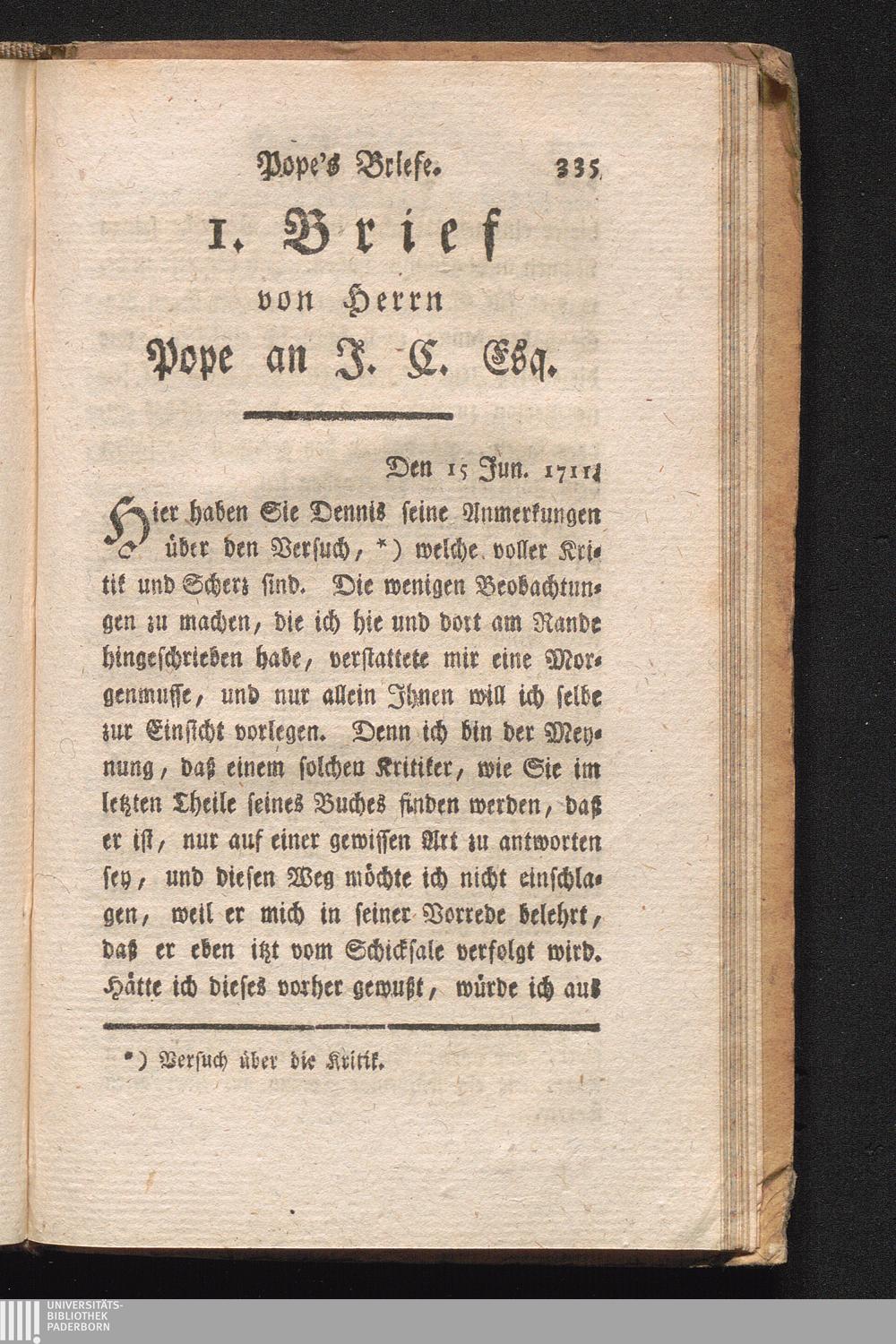 Brief. I. An J. C. Esq. Anmerkungen über den Versuch über die Kritik.
