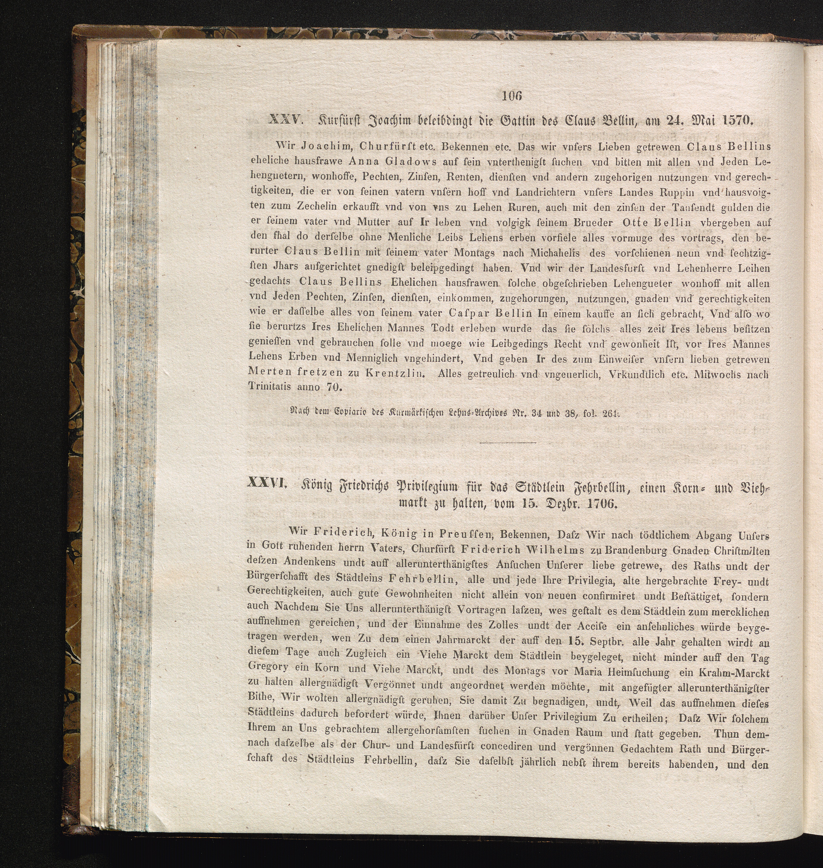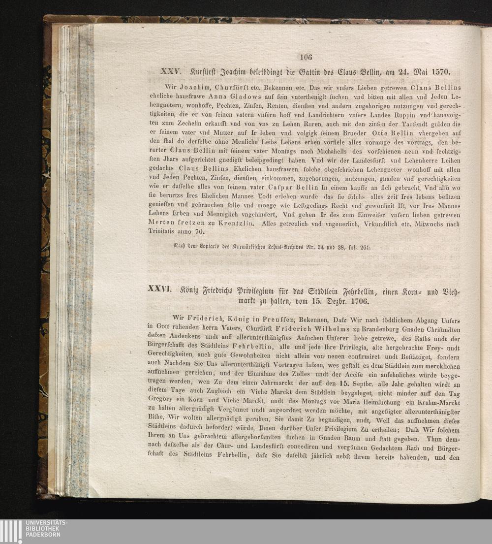 XXVI. König Friedrichs Privilegium für das Städtlein Fehrbellin, einen Korn- und[...]