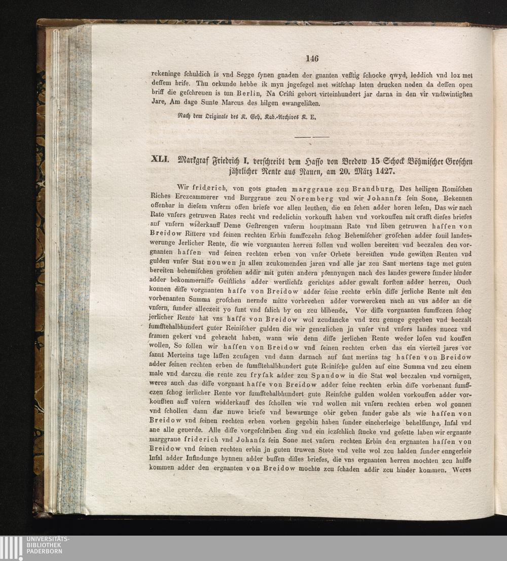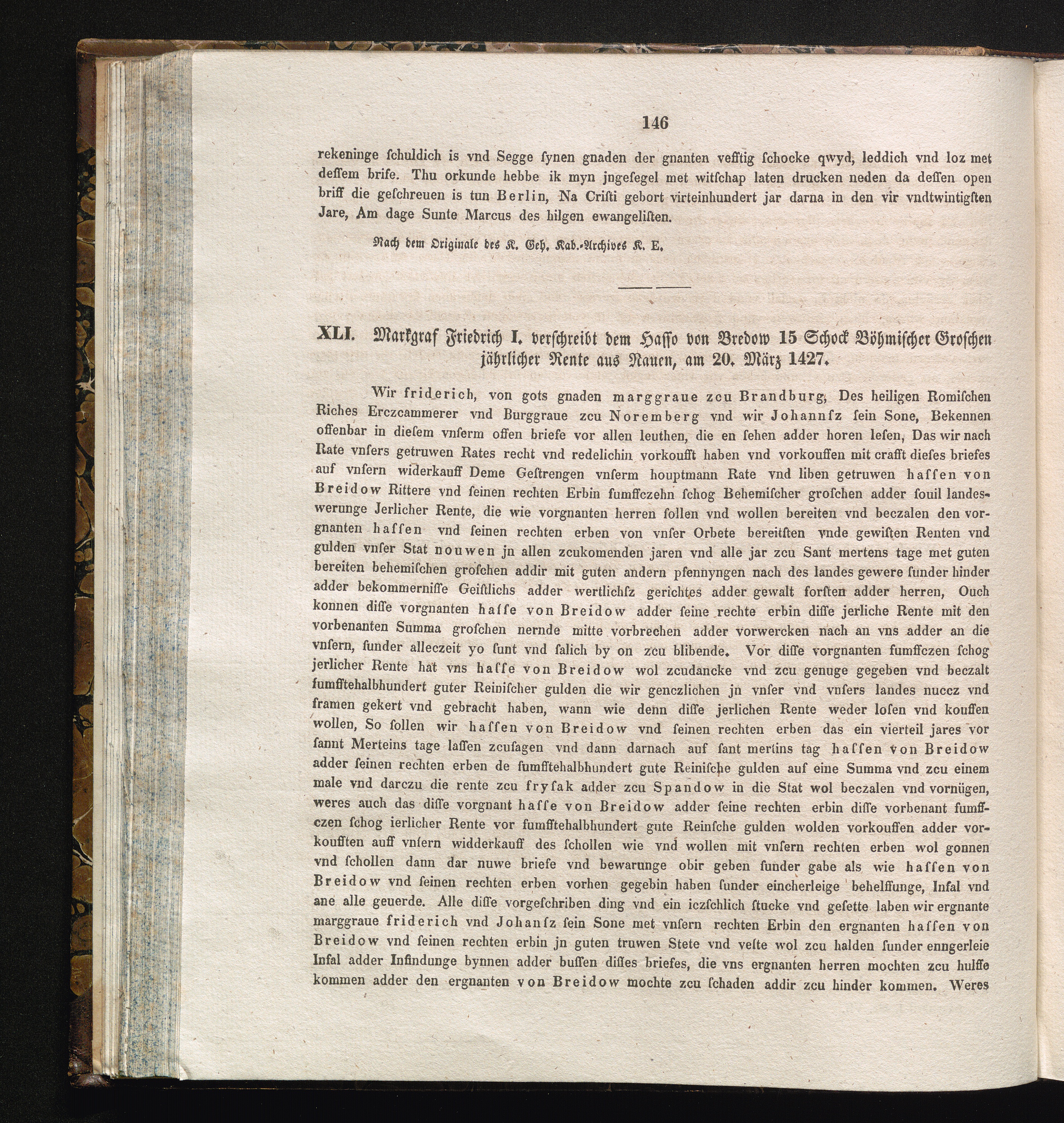 XLI. Markgraf Friedrich I. verschreibt dem Hasso von Bredow 15 Schock Böhmischer[...]