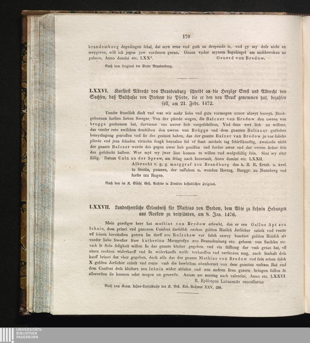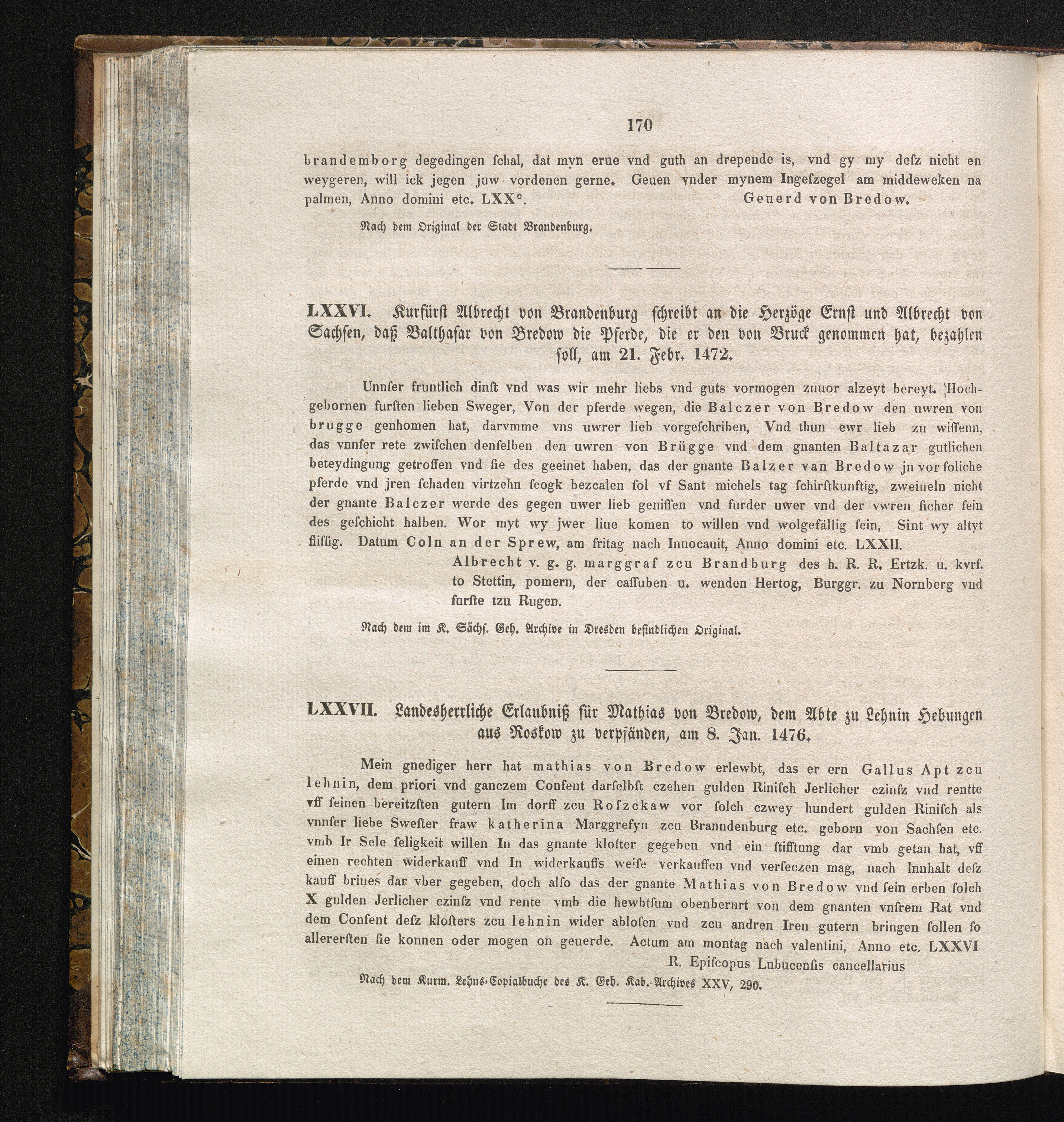 LXXVII. Landesherrliche Erlaubniß für Mathias von Bredow, dem Abte zu Lehnin Hebungen[...]