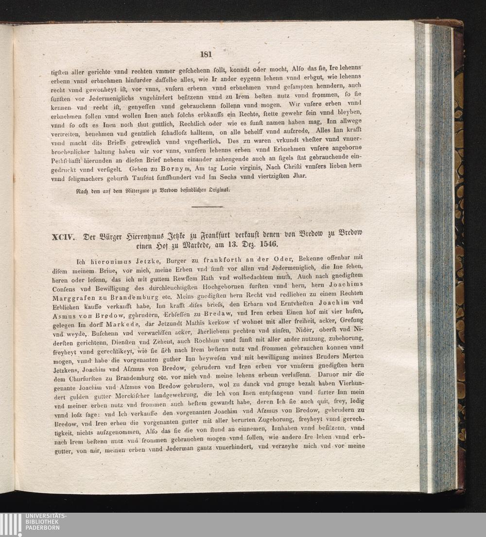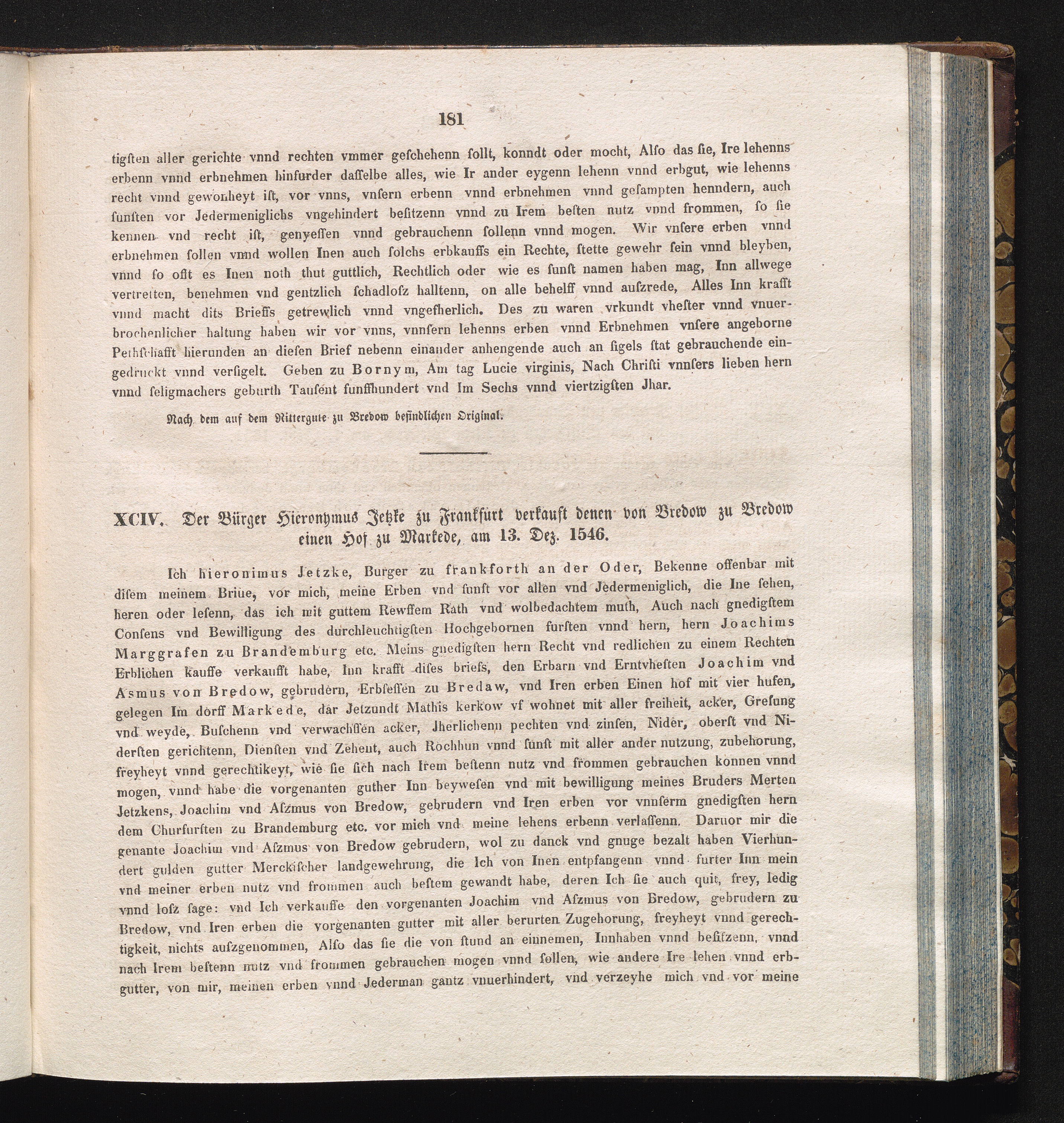 XCIV. Der Bürger Hieronymus Jetzke zu Frankfurt verkauft denen von Bredow zu Bredow[...]