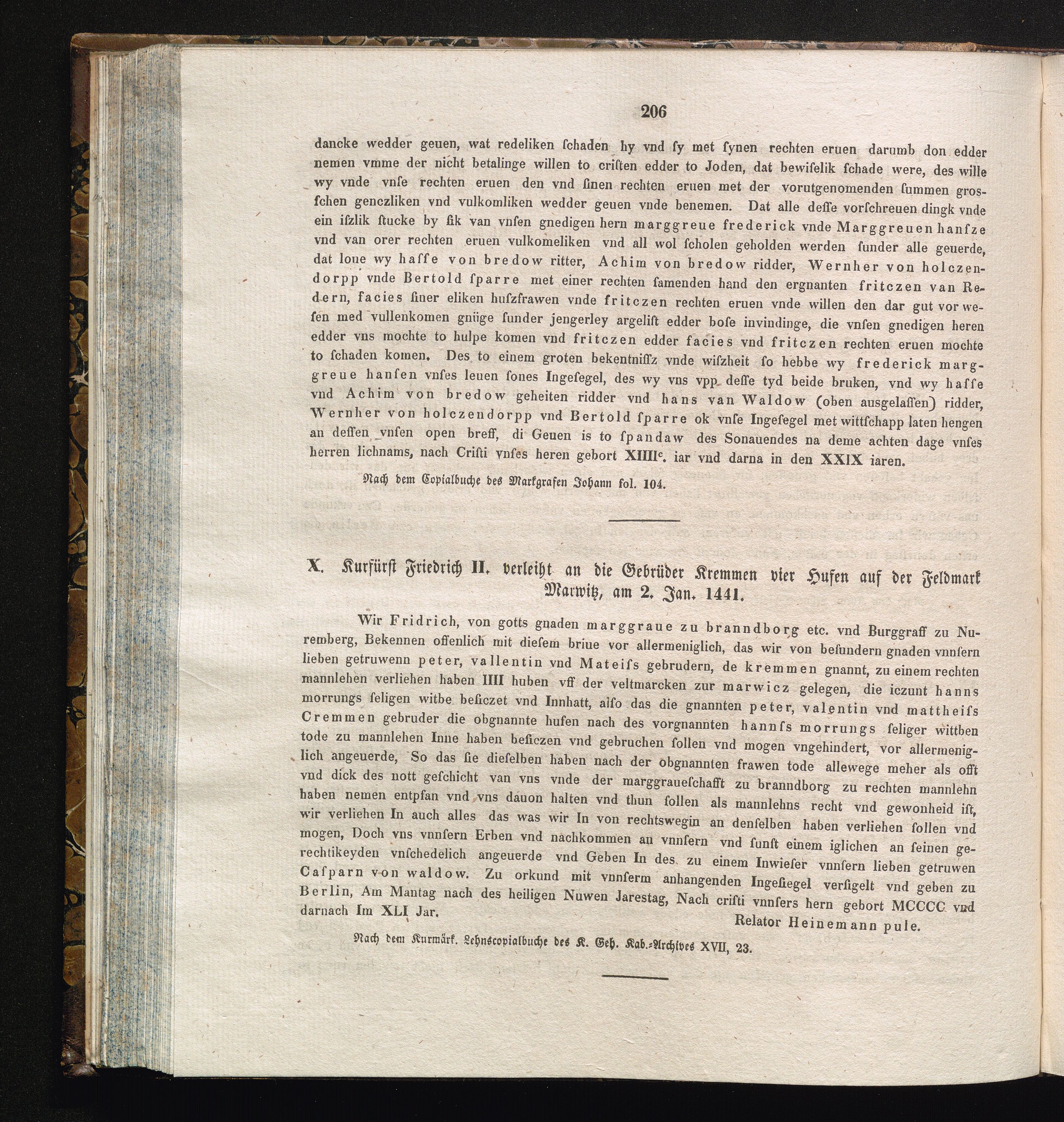X. Kurfürst Friedrich II. verleiht an die Gebrüder Kremmen vier Hufen auf der Feldmark[...]