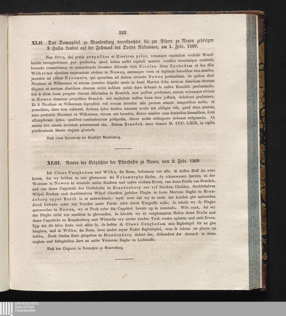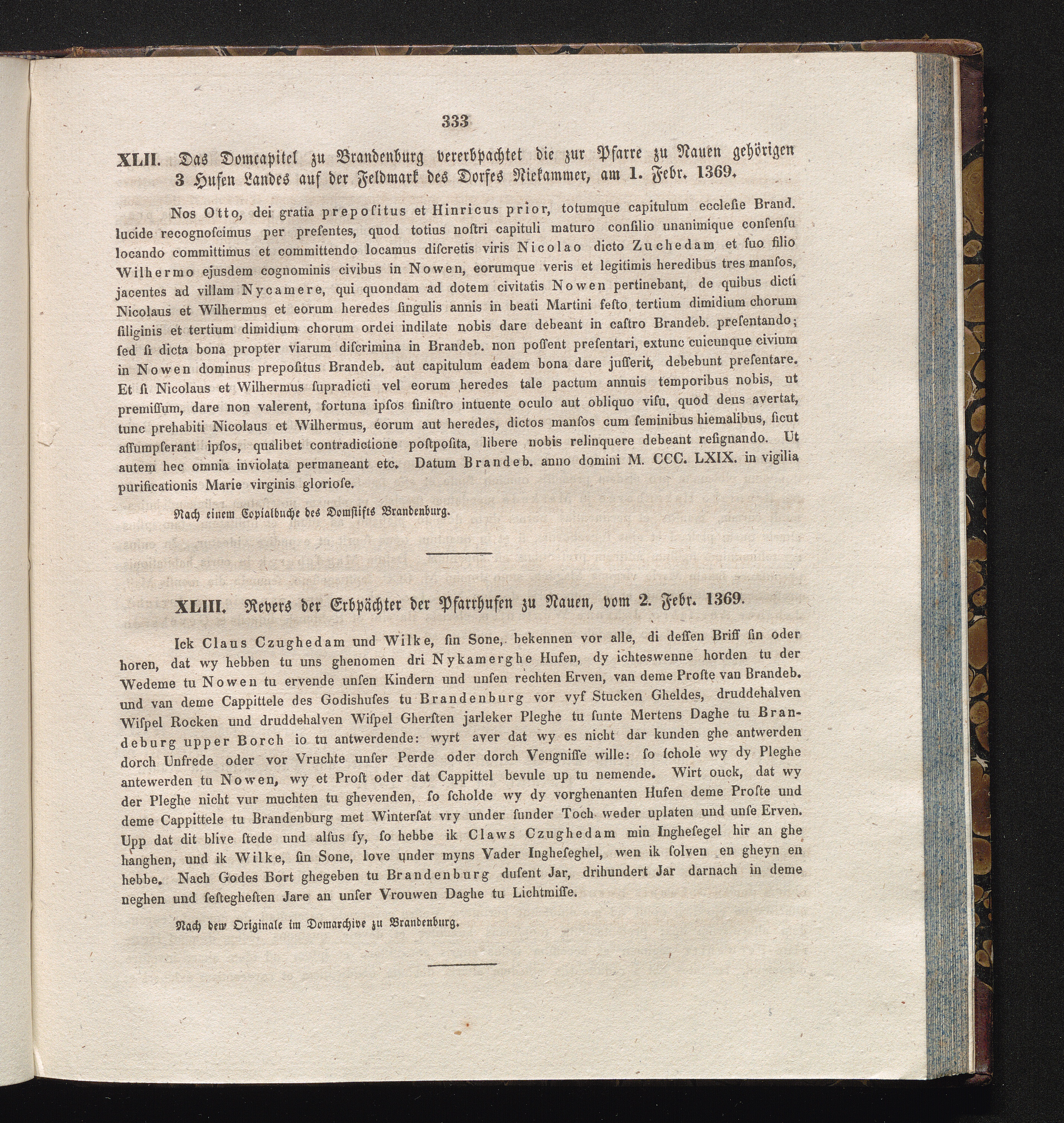 XLIII. Revers der Erbpächter der Pfarrhufen zu Nauen, vom 2. Febr. 1369.