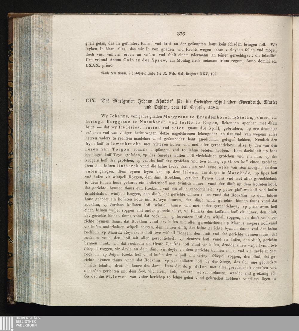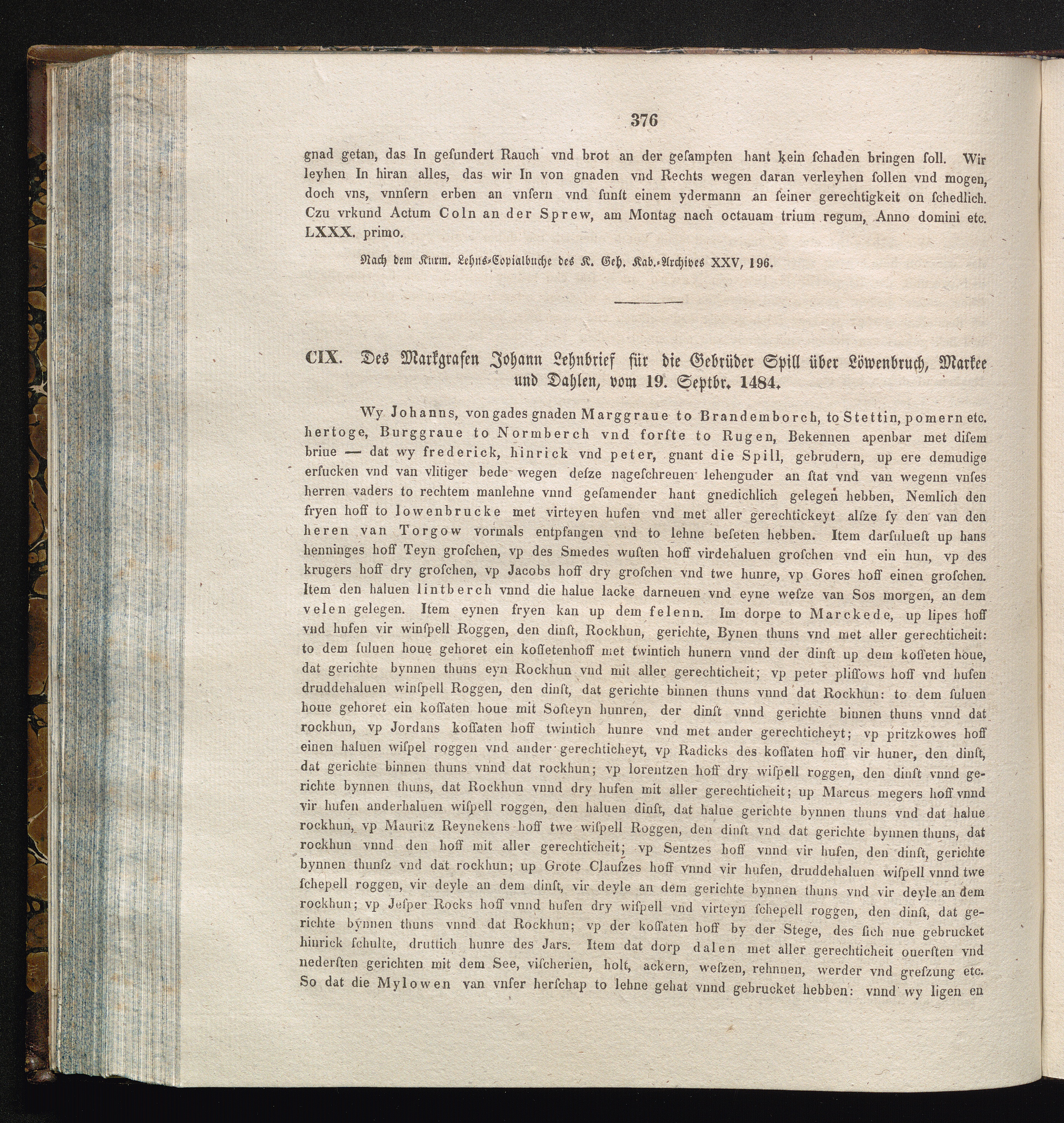 CIX. Des Markgrafen Johann Lehnbrief für die Gebrüder Spill über Löwenbruch, Markee[...]