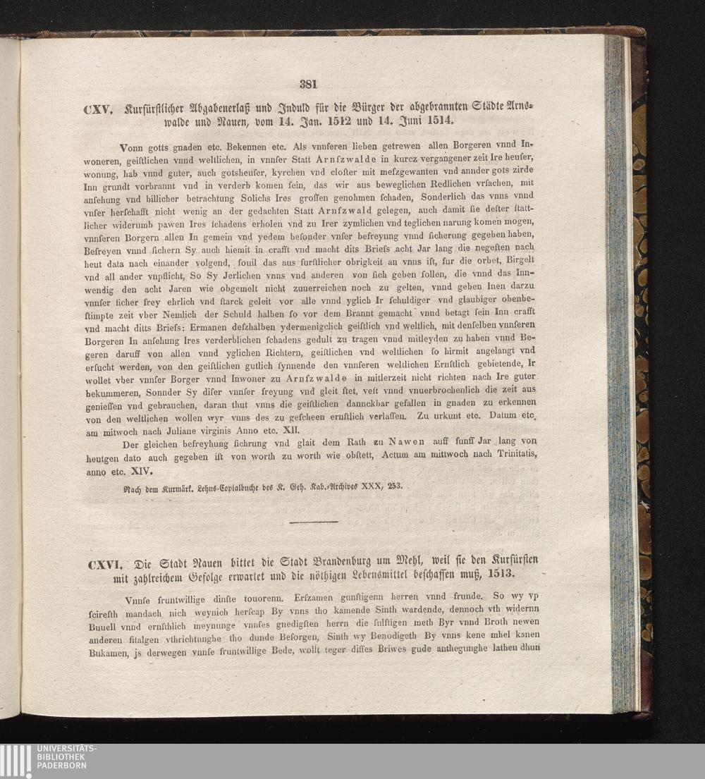 CXVI. Die Stadt Nauen bittet die Stadt Brandenburg um Mehl, weil sie den Kurfürsten[...]