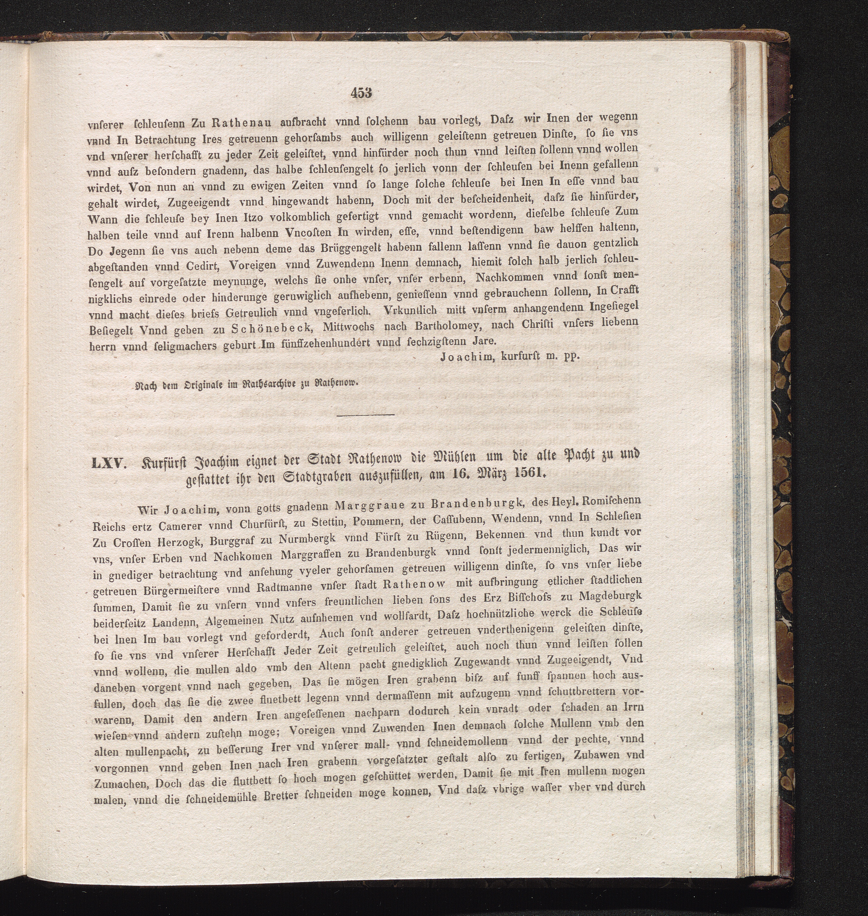 LXV. Kurfürst Joachim eignet der Stadt Rathenow die Mühlen um die alte Pacht zu und[...]