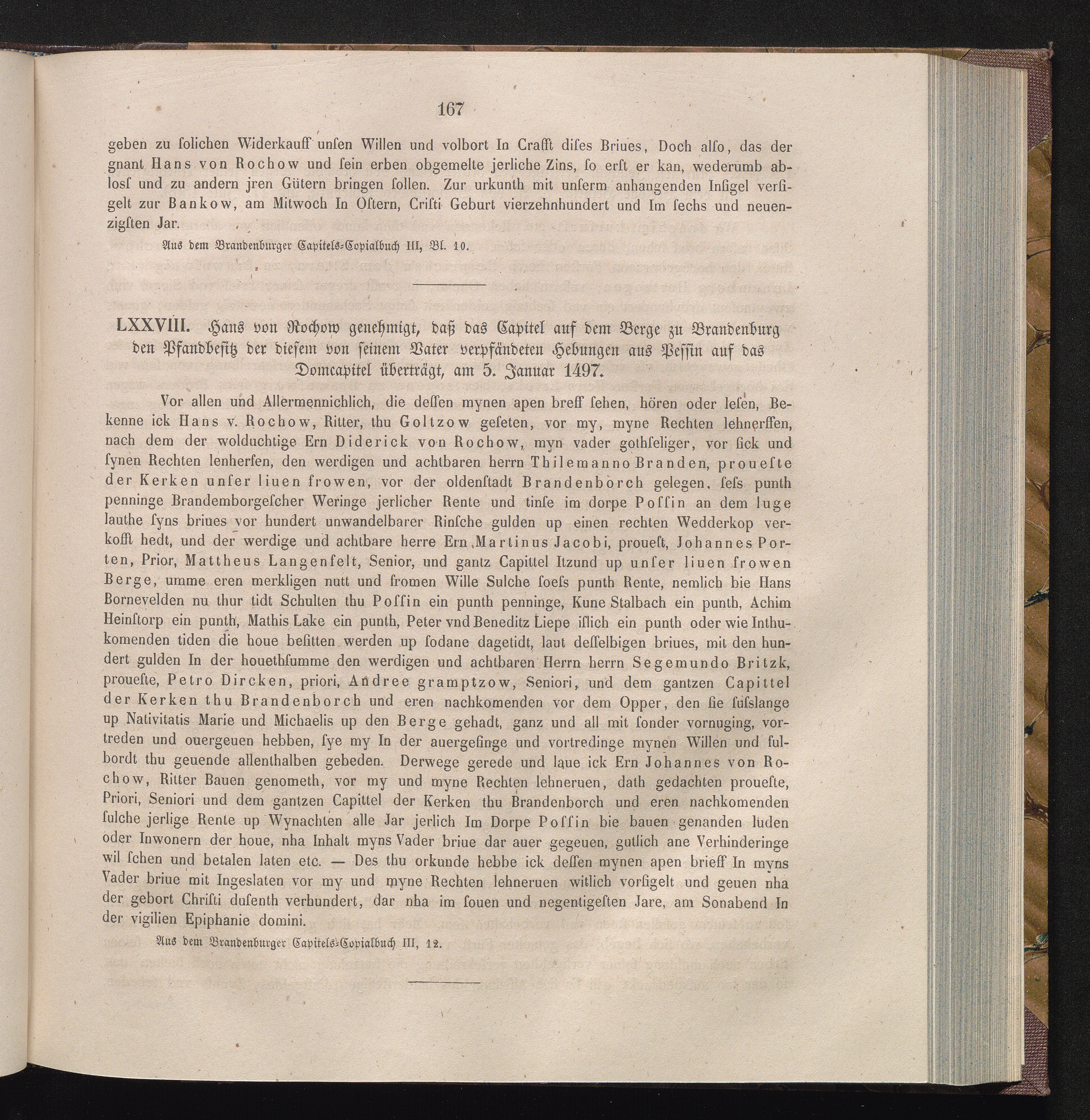 LXXVIII. Hans von Rochow genehmigt, daß das Capitel auf dem Berge zu Brandenburg[...]
