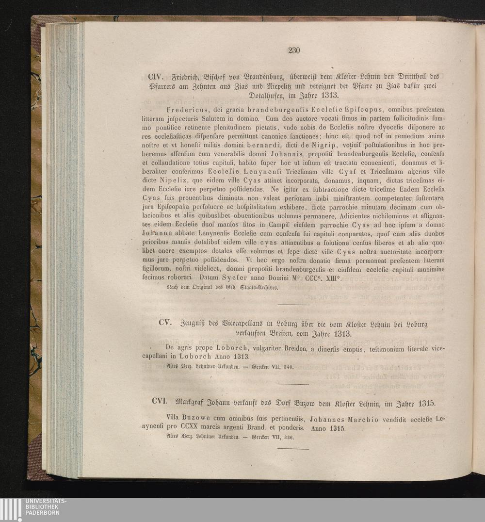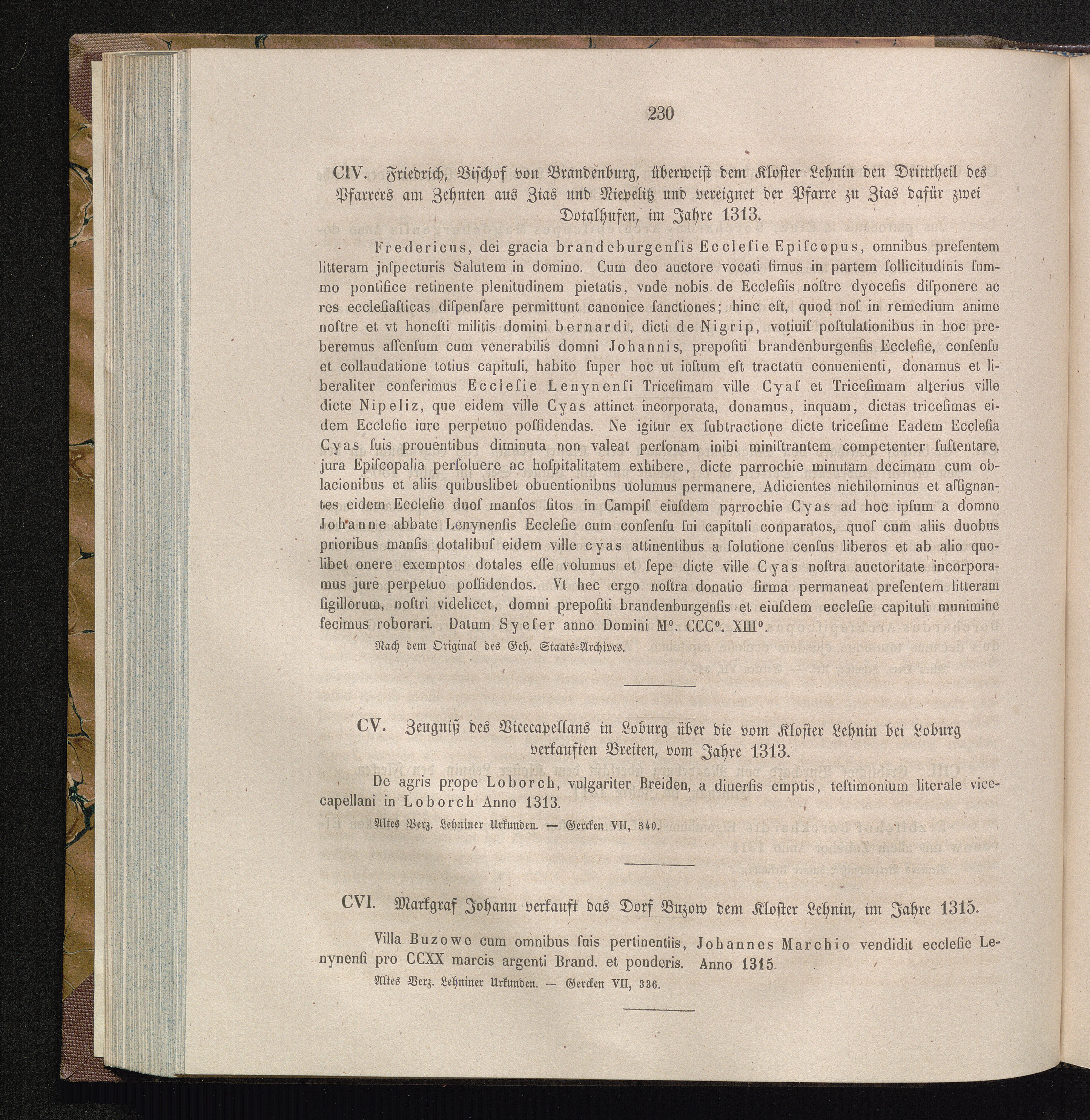 CVI. Markgraf Johann verkauft das Dorf Buzow dem Kloster Lehnin, im Jahre 1315.