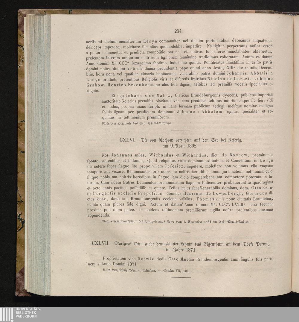 CXLVII. Markgraf Otto giebt dem Kloster Lehnin das Eigenthum an dem Dorfe Derwitz,[...]