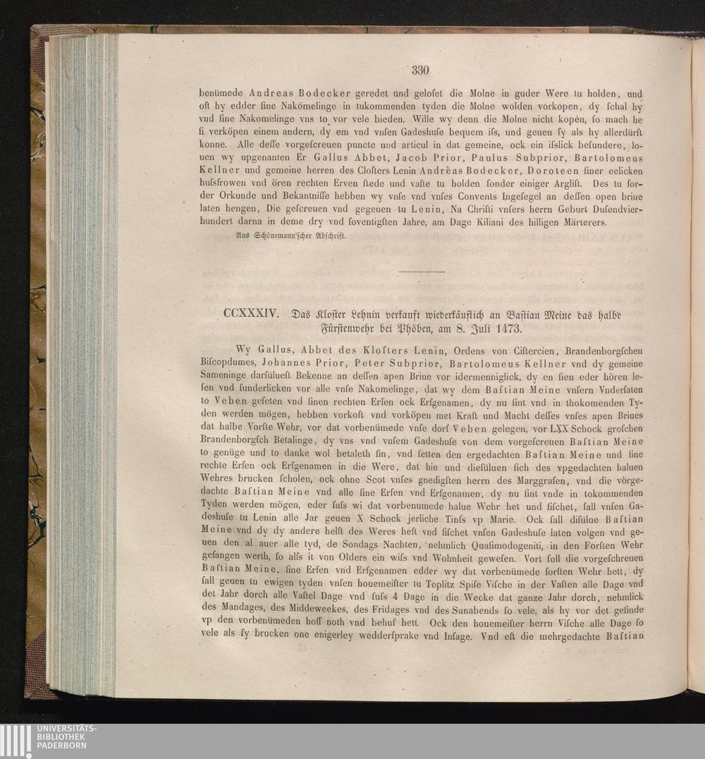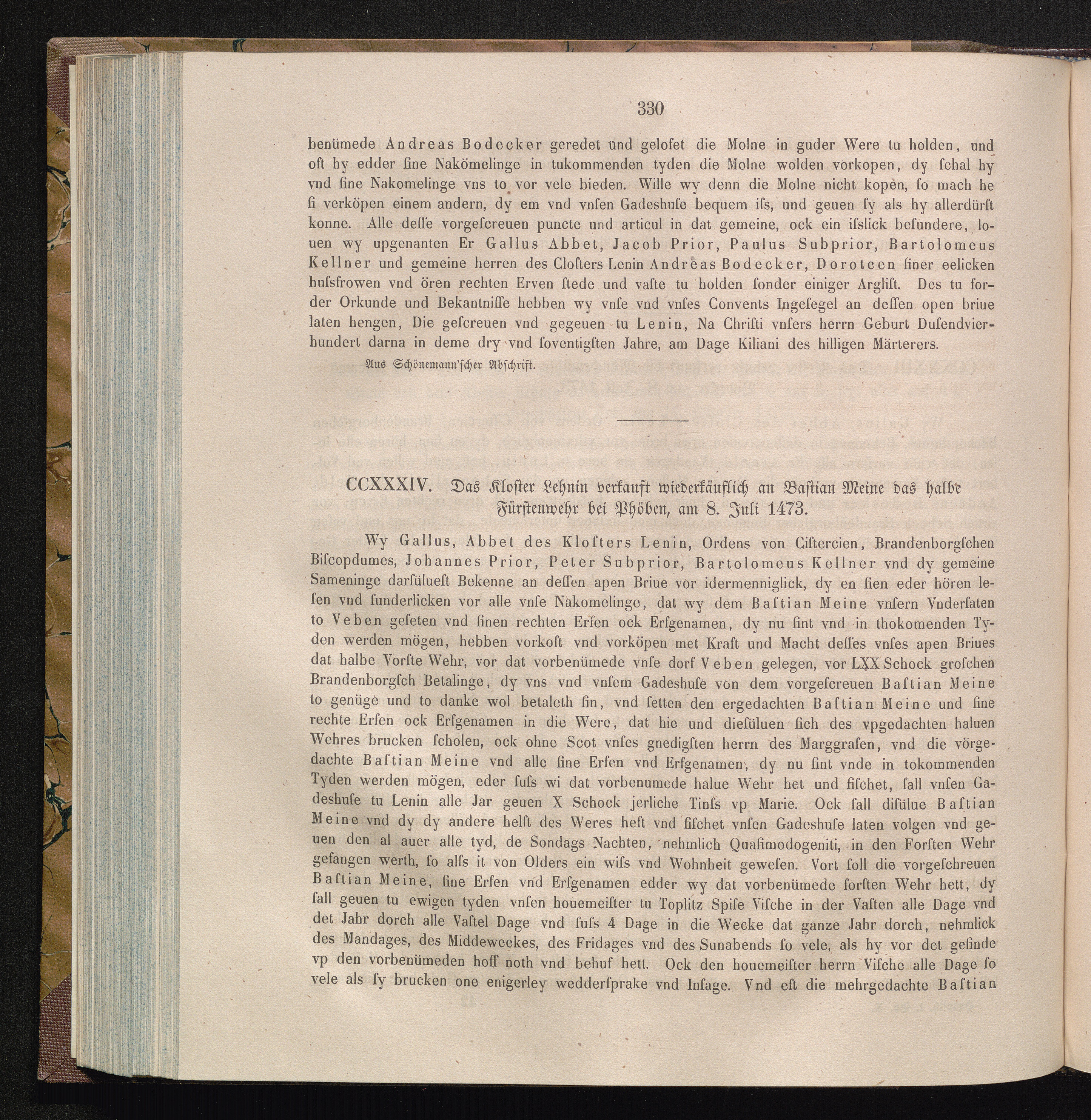 CCXXXIV. Das Kloster Lehnin verkauft wiederkäuflich an Bastian Meine das halbe Fürstenwehr[...]