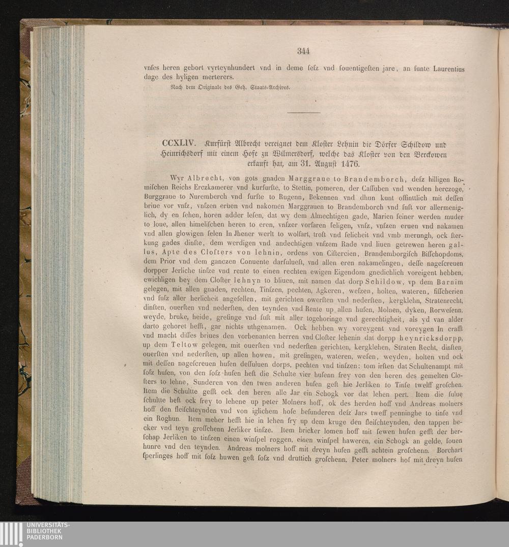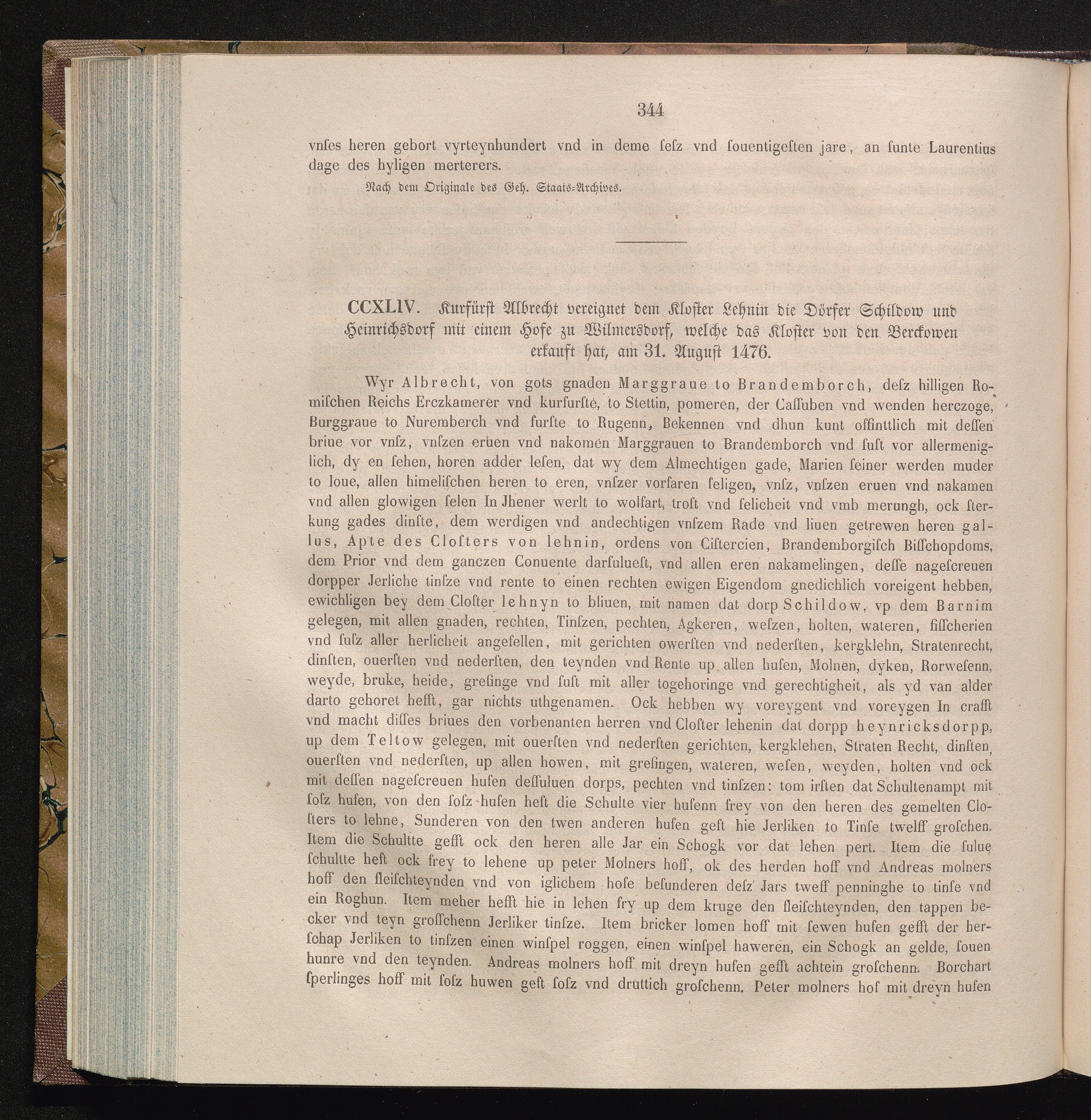 CCXLIV. Kurfürst Albrecht vereignet dem Kloster Lehnin die Dörfer Schildow und Heinrichsdorf[...]