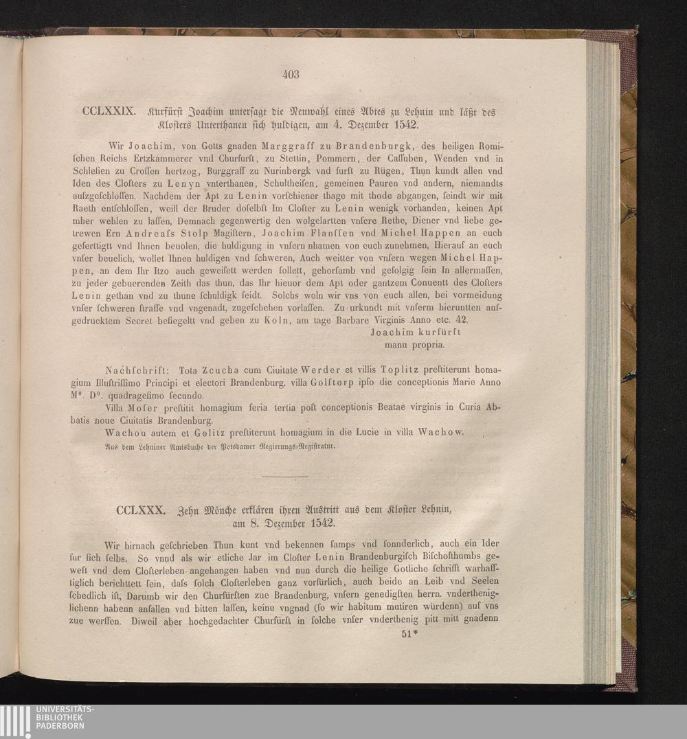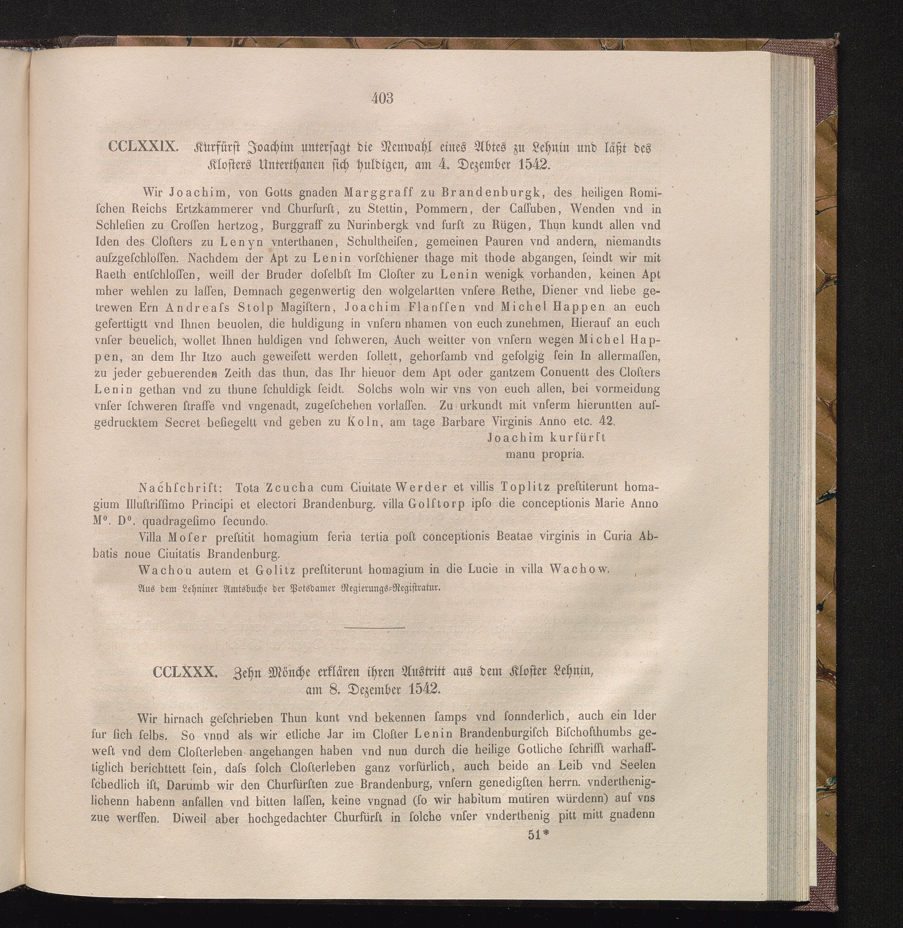 CCLXXX. Zehn Mönche erklären ihren Austritt aus dem Kloster Lehnin, am 8. Dezember[...]