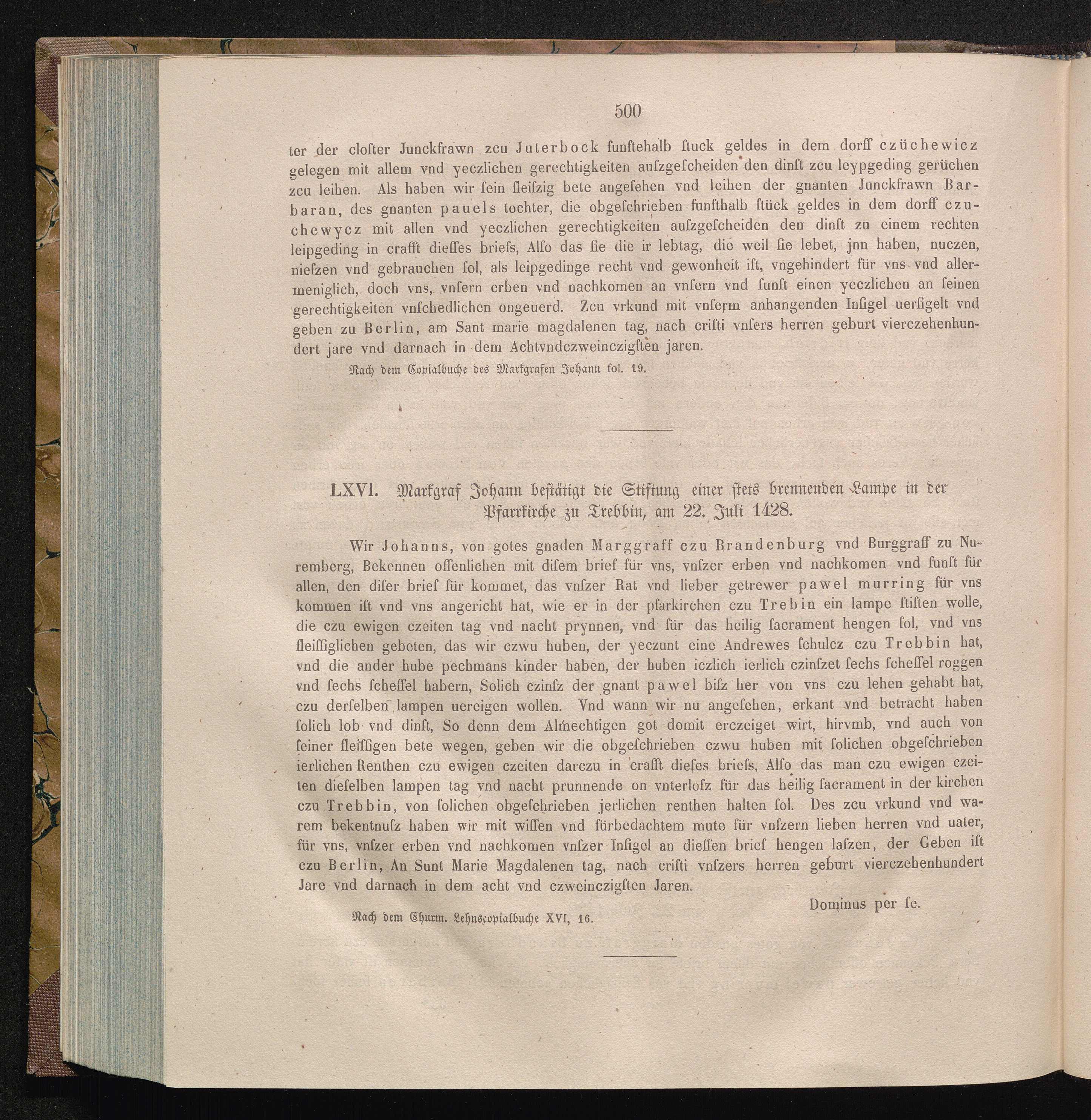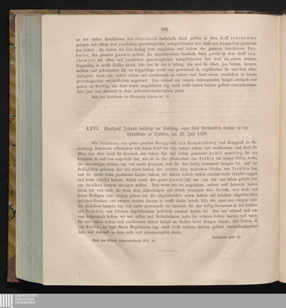 LXVI. Markgraf Johann bestätigt die Stiftung einer stets brennenden Lampe in der[...]