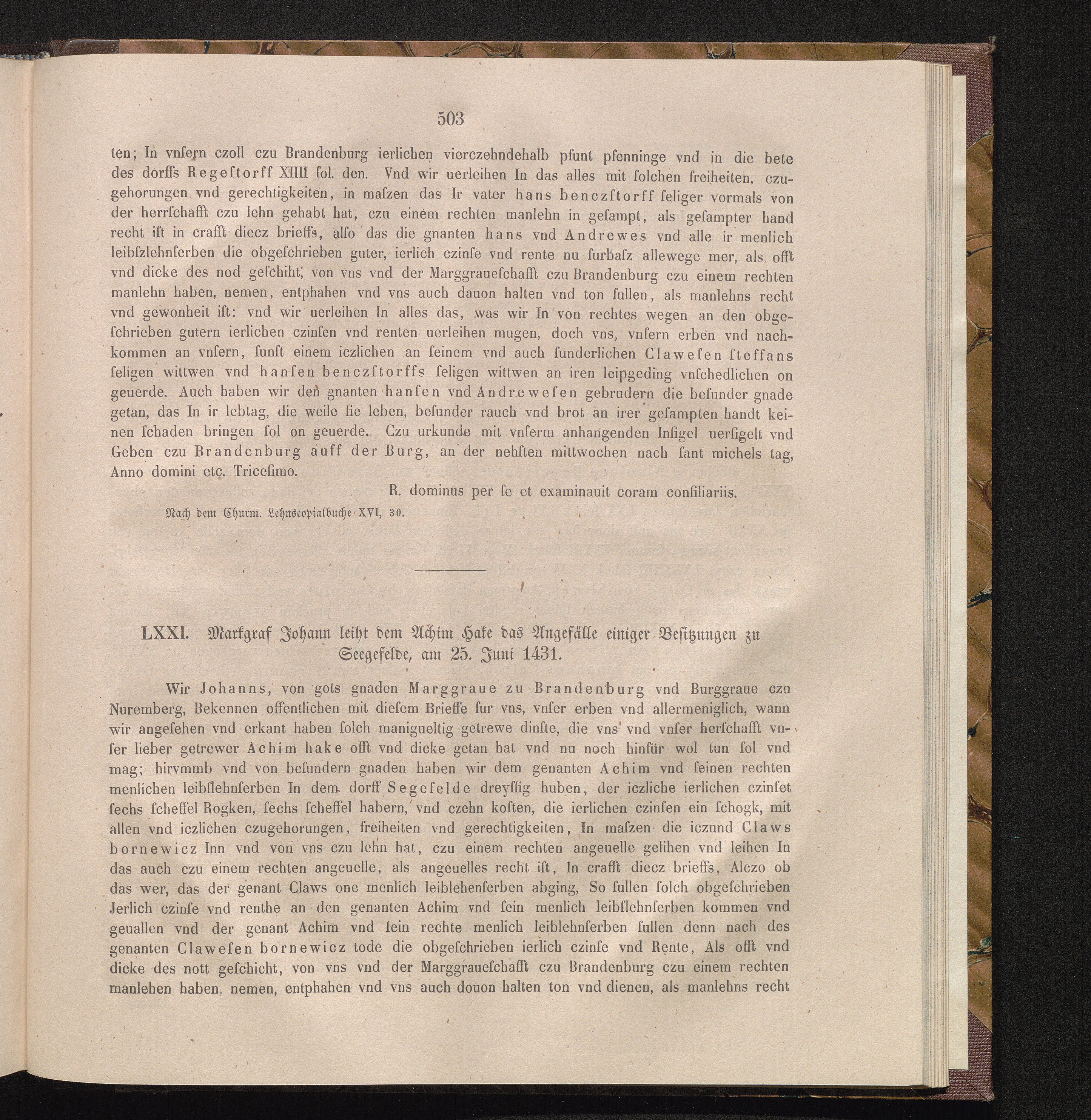 LXXI. Markgraf Johann leiht dem Achim Hake das Angefälle einiger Besitzungen zu Seegefelde,[...]