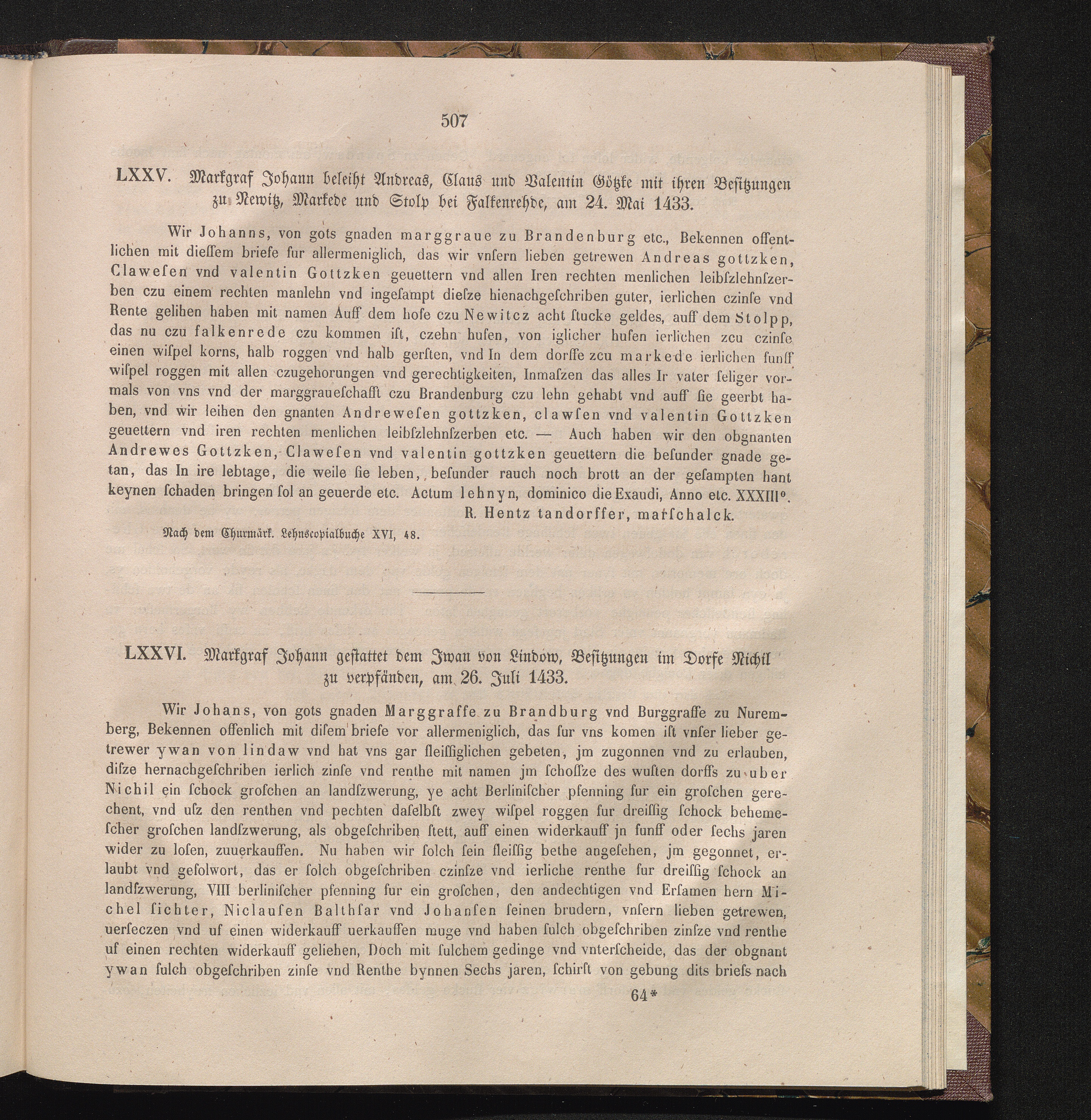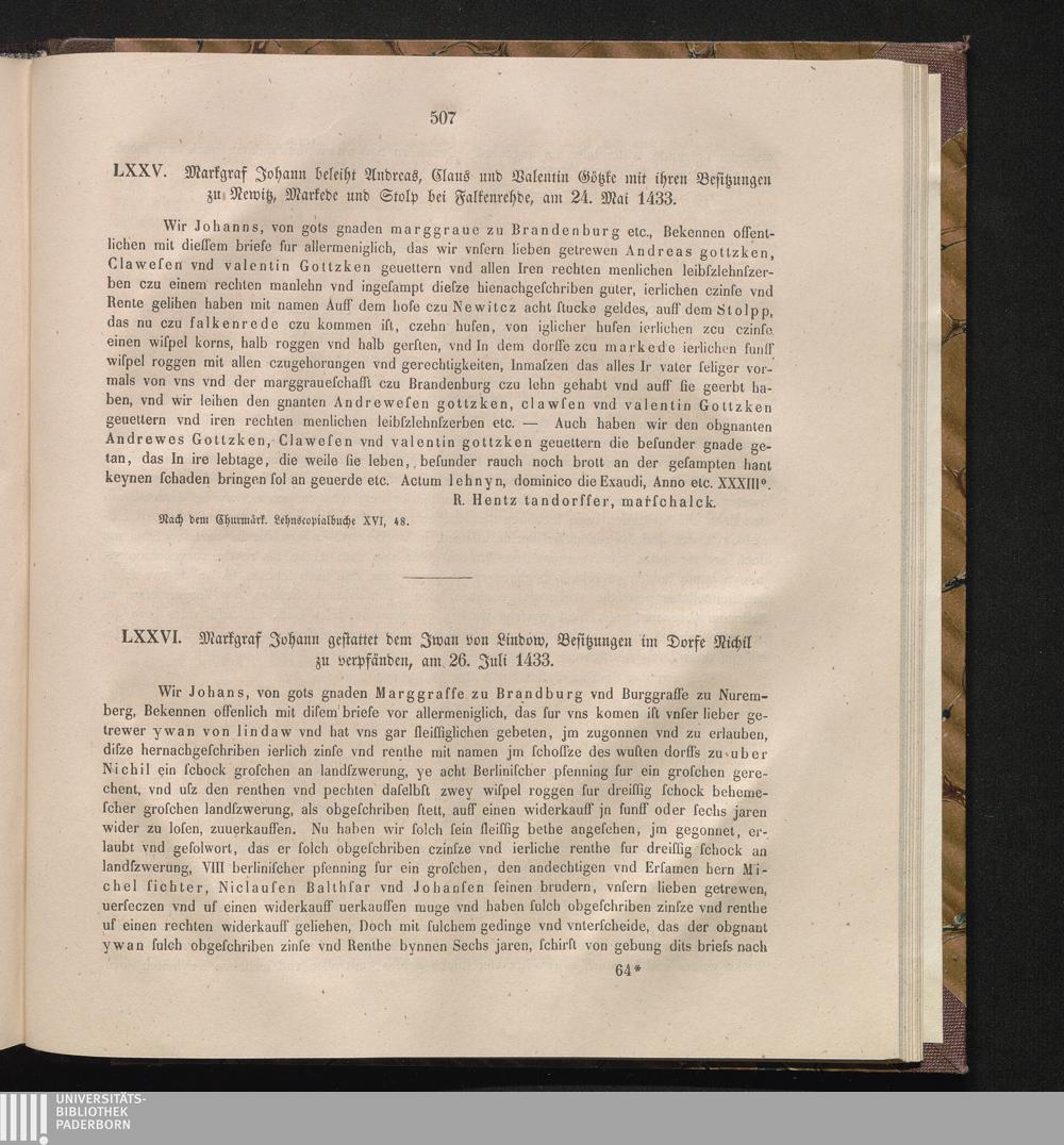 LXXVI. Markgraf Johann gestattet dem Iwan von Lindow, Besitzungen im Dorfe Nichil[...]