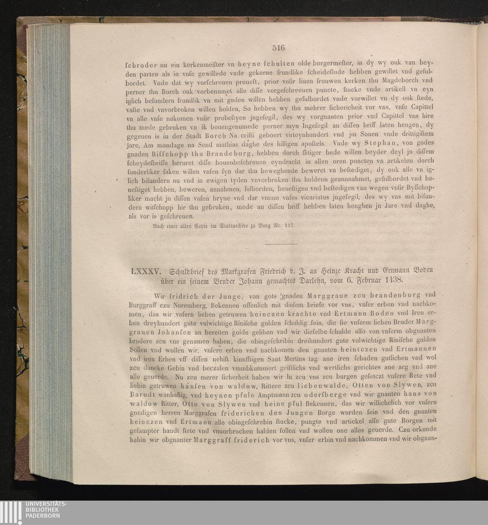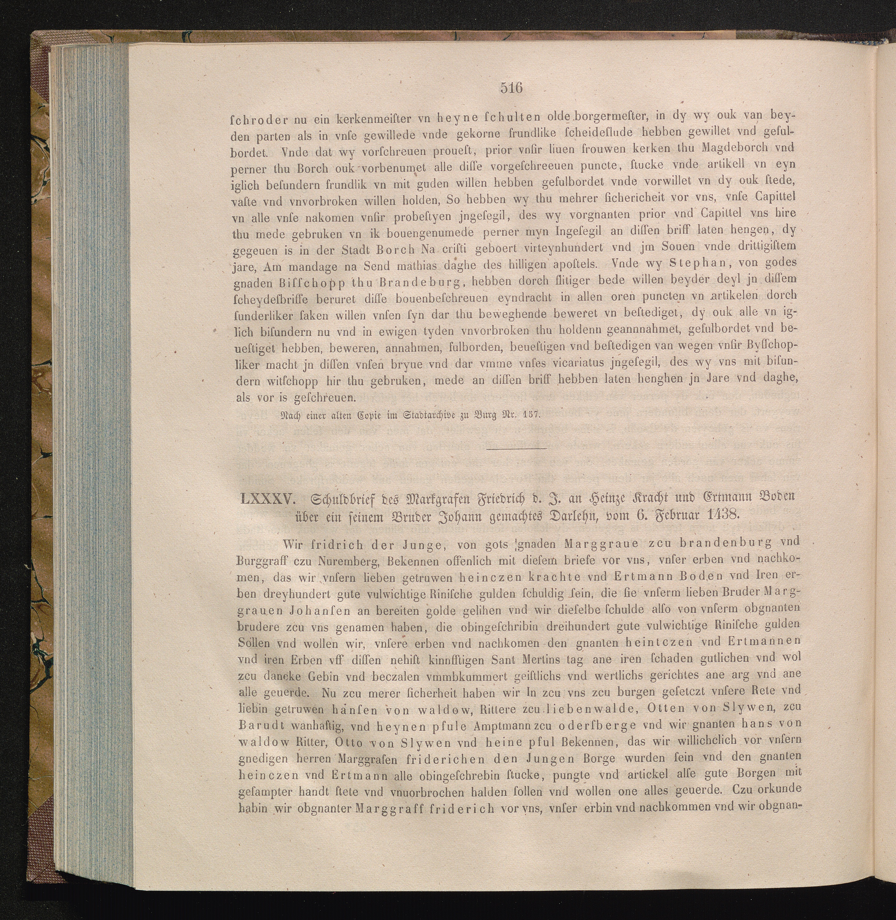 LXXXV. Schuldbrief des Markgrafen Friedrich d. J. an Heinze Kracht und Ertmann Boden[...]