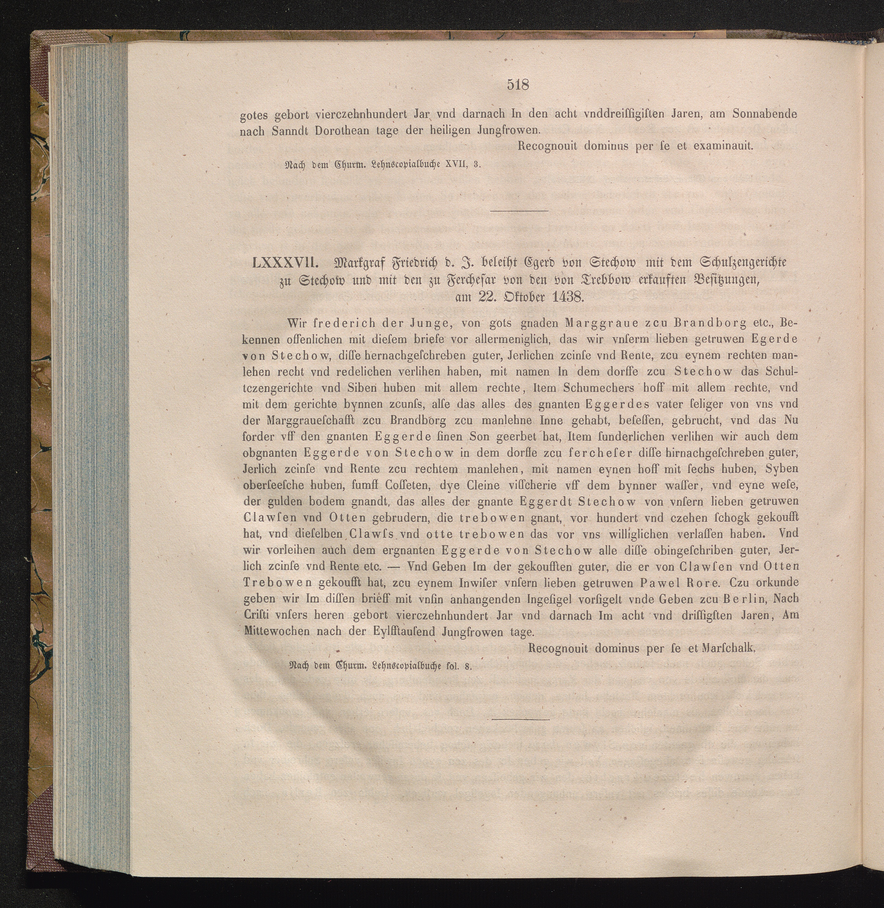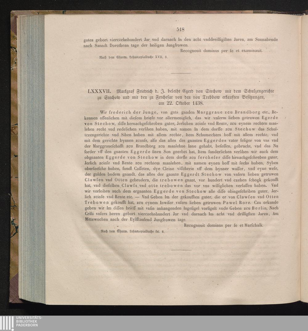 LXXXVII. Markgraf Friedrich d. J. beleiht Egerd von Stechow mit dem Schulzengerichte[...]