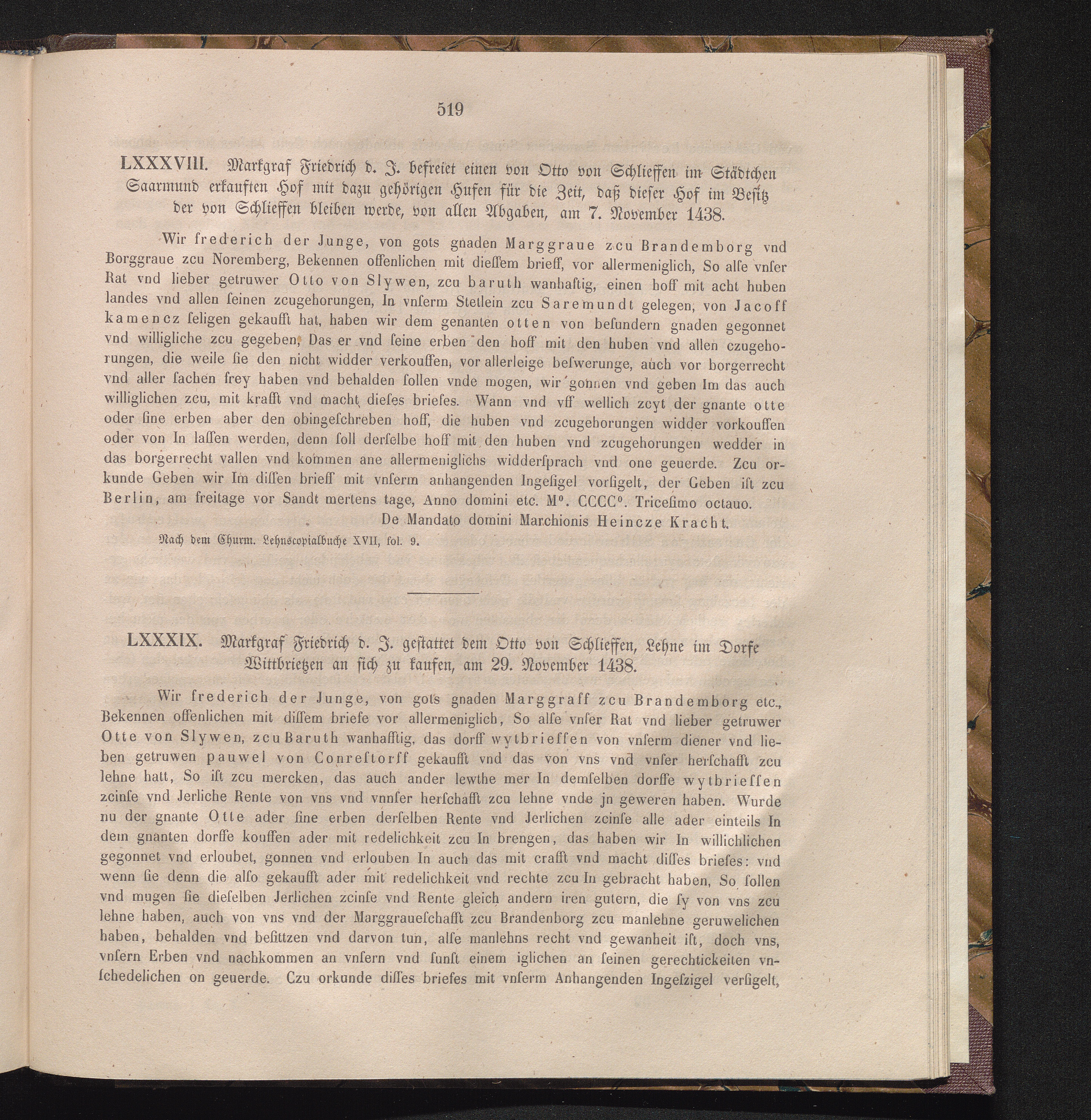 LXXXIX. Markgraf Friedrich d. J. gestattet dem Otto von Schlieffen, Lehne im Dorfe[...]