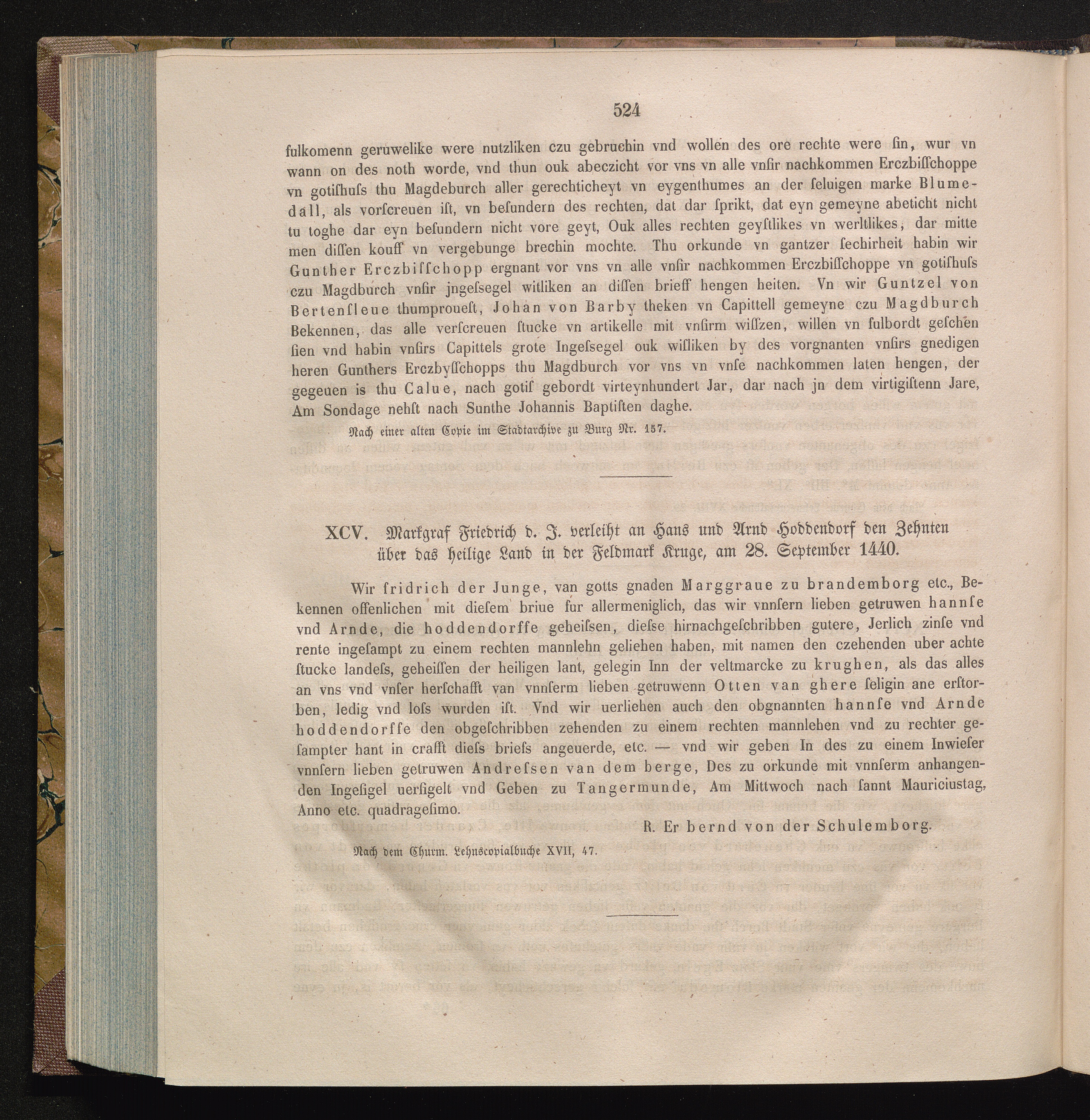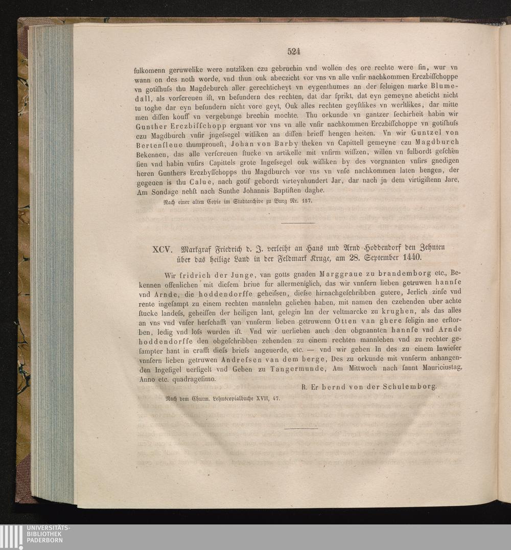 XCV. Markgraf Friedrich d. J. verleiht an Hans und Arnd Hoddendorf den Zehnten über[...]