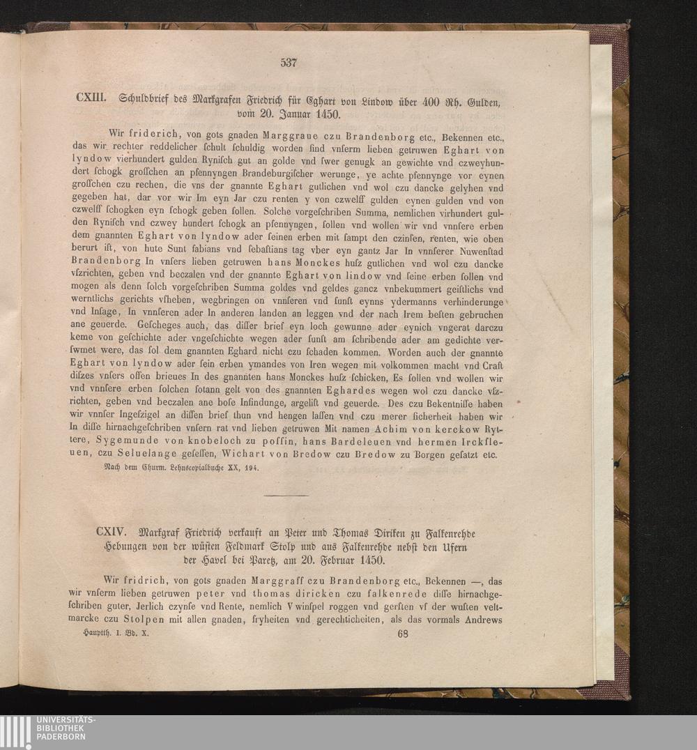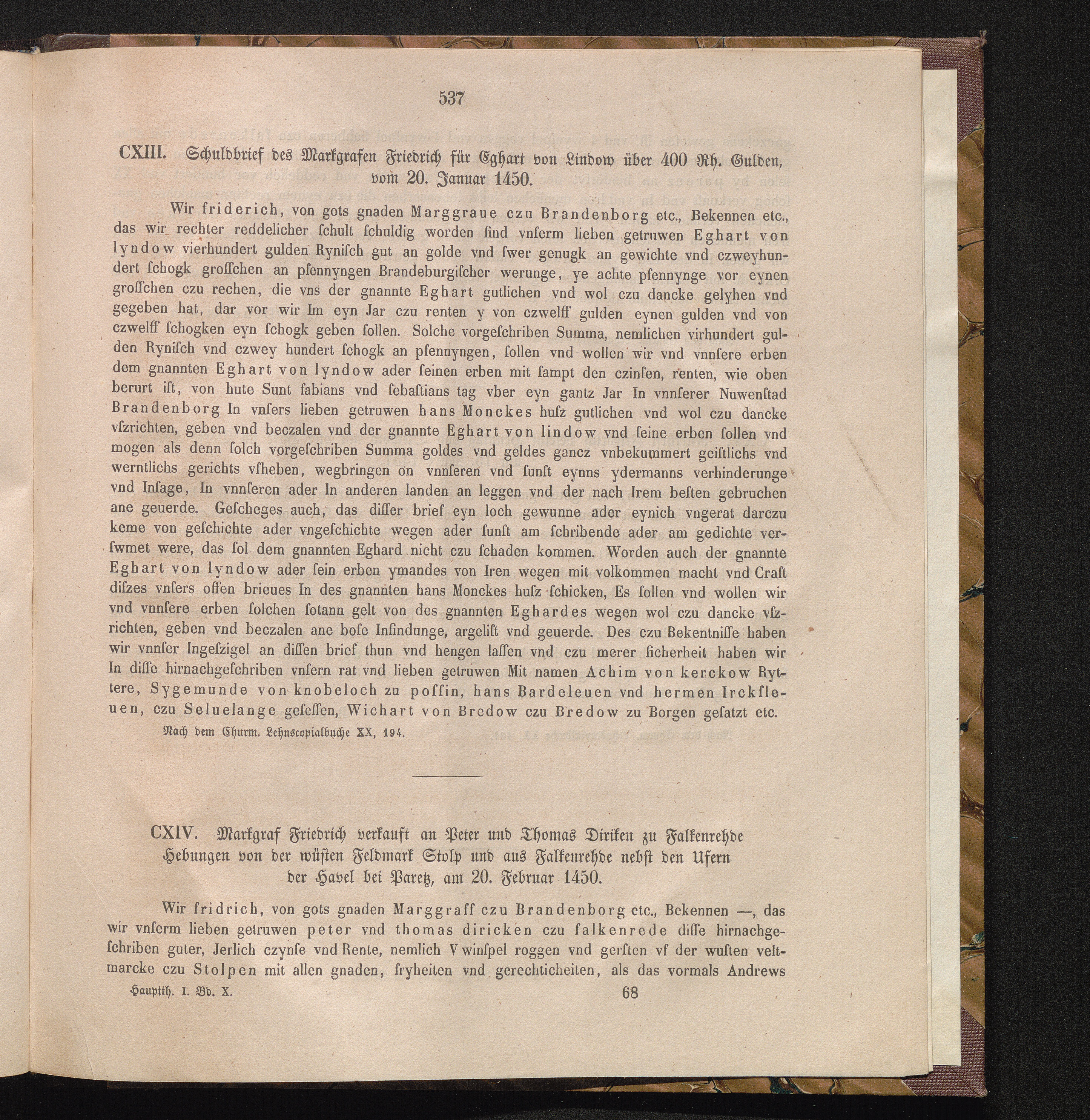 CXIV. Markgraf Friedrich verkauft an Peter und Thomas Diriken zu Falkenrehde Hebungen[...]