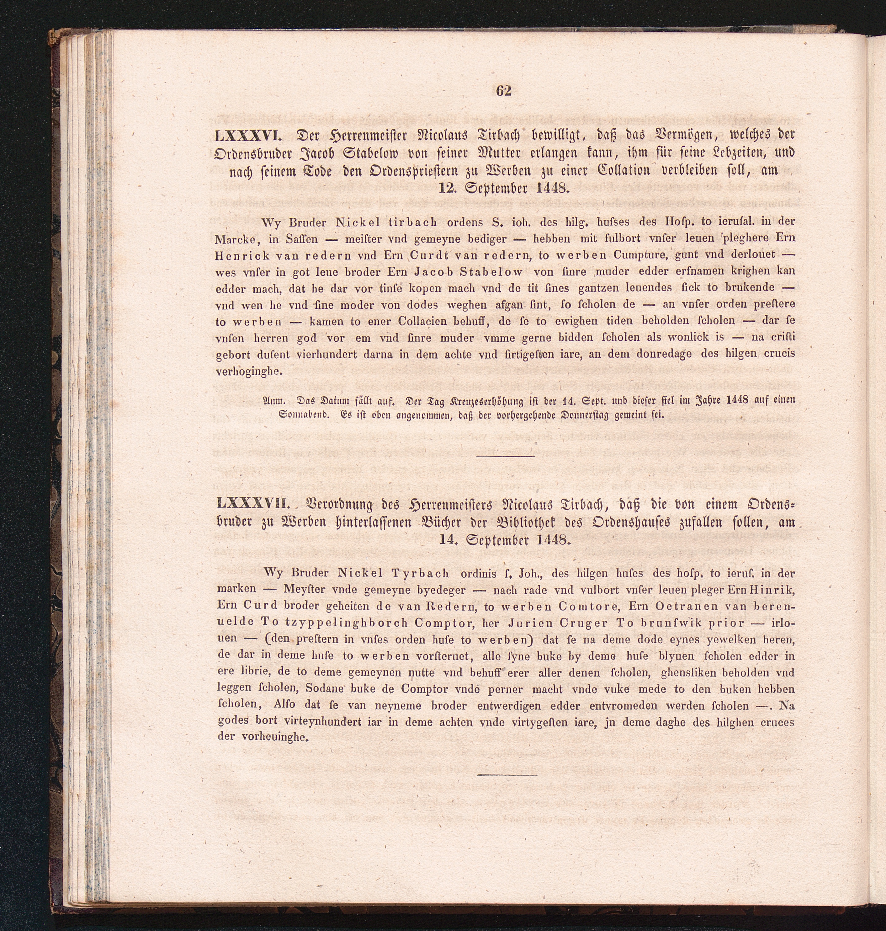 LXXXVII. Verordnung des Herrenmeisters Nicolaus Tirbach, daß die von einem Ordensbruder[...]