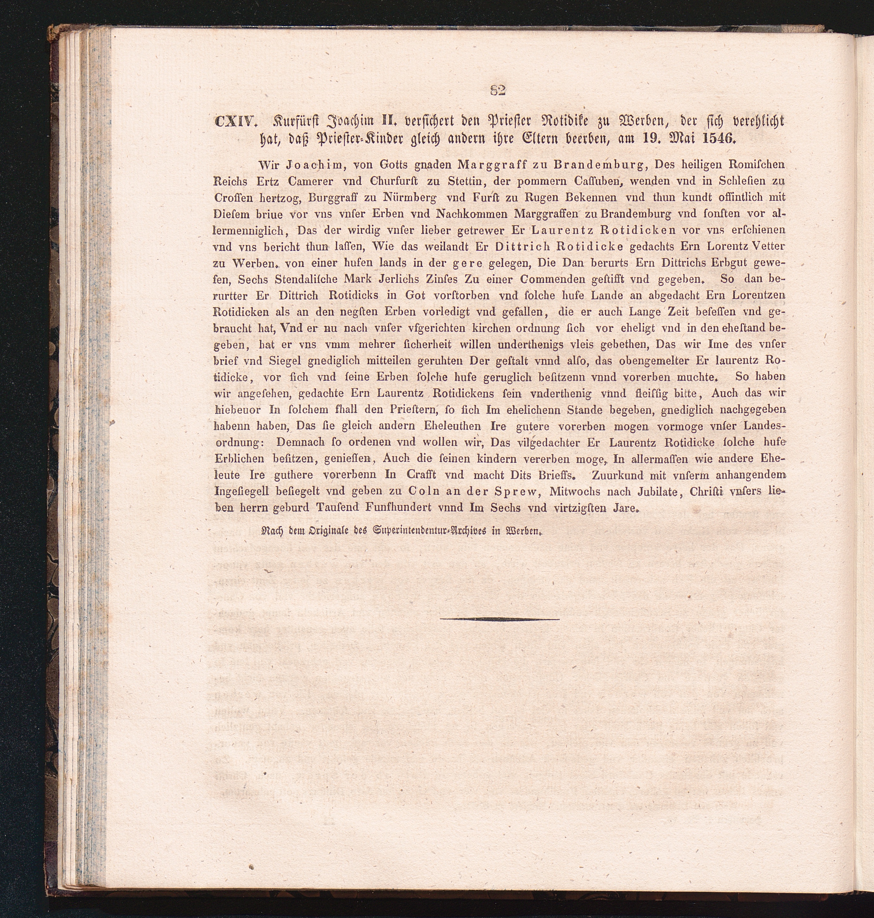CXIV. Kurfürst Joachim II. versichert den Priester Rotidike zu Werben, der sich verehlicht[...]