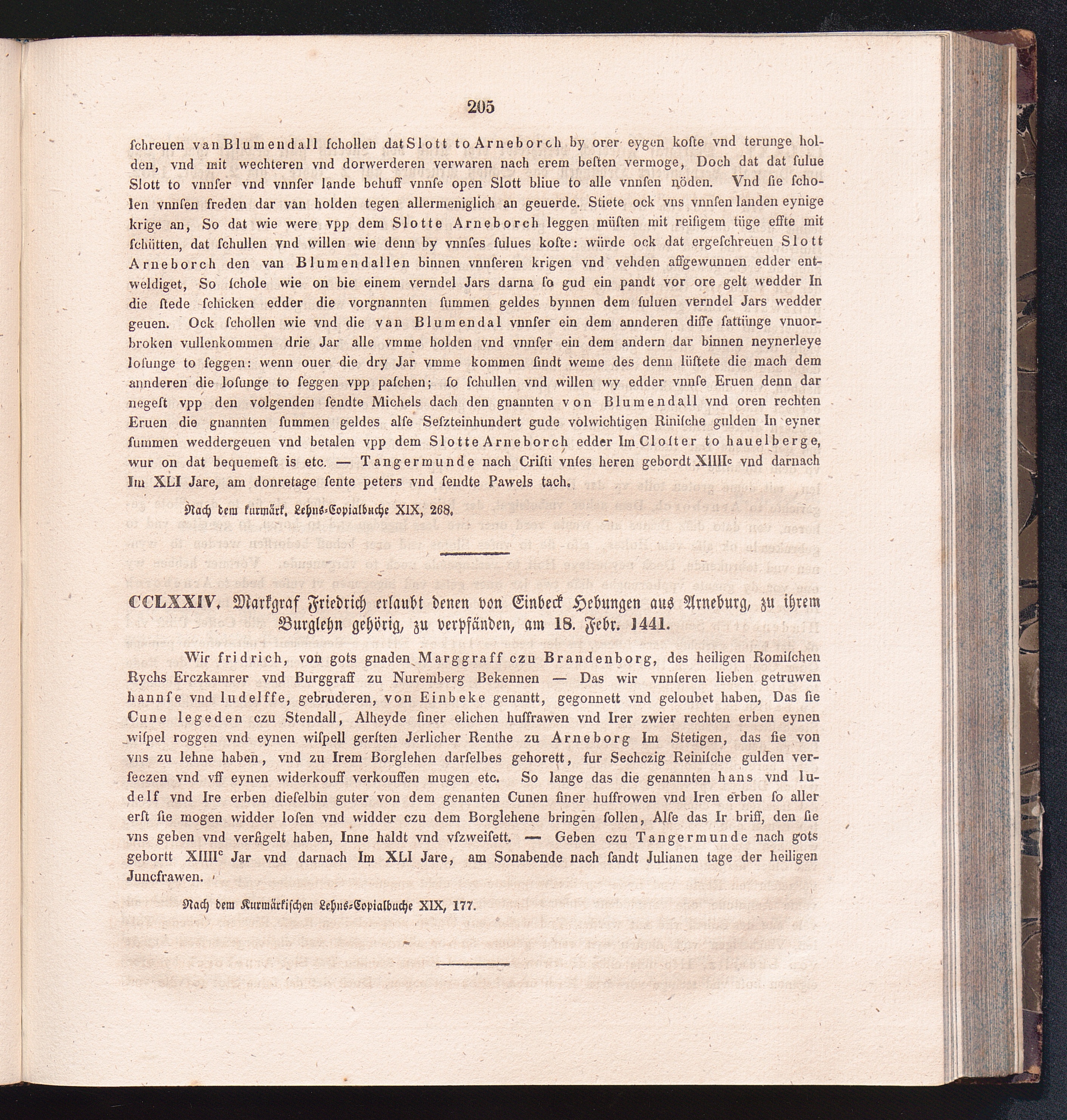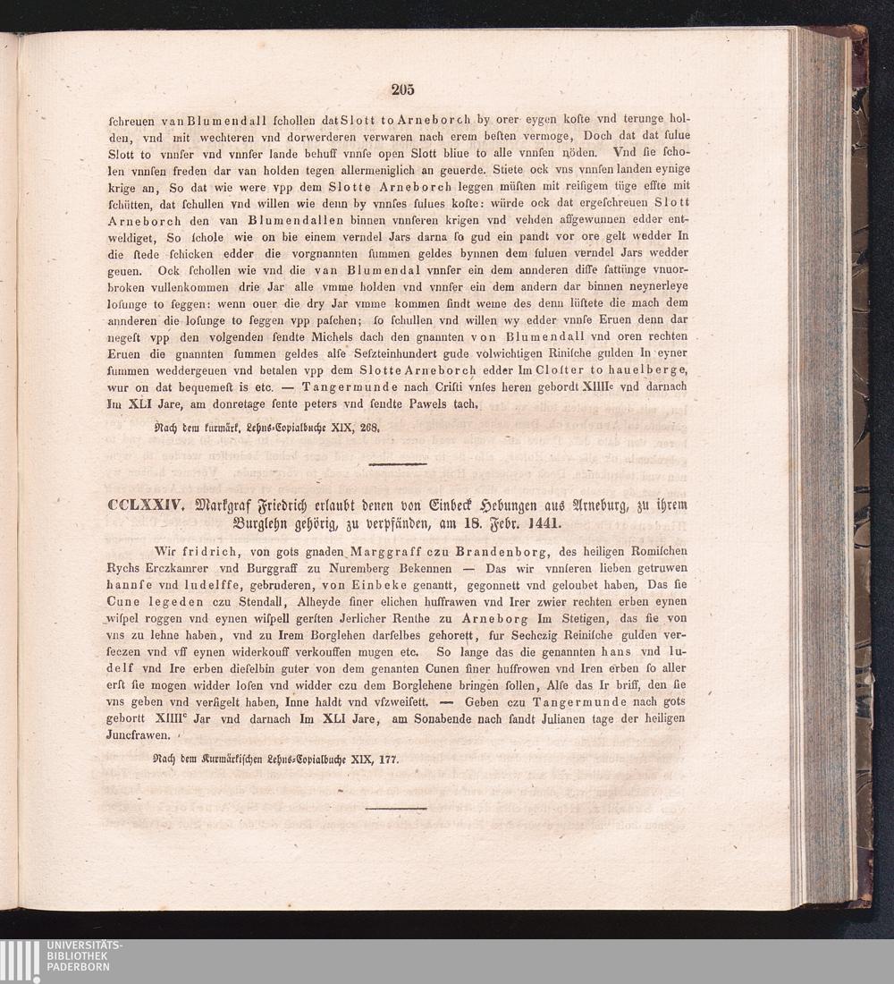 CCLXXIV. Markgraf Friedrich erlaubt denen von Einbeck Hebungen aus Arneburg, zu ihrem[...]