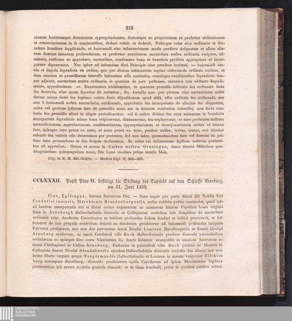 CCLXXXII. Papst Pius II. bestätigt die Stiftung des Capitels auf dem Schlosse Arneburg,[...]