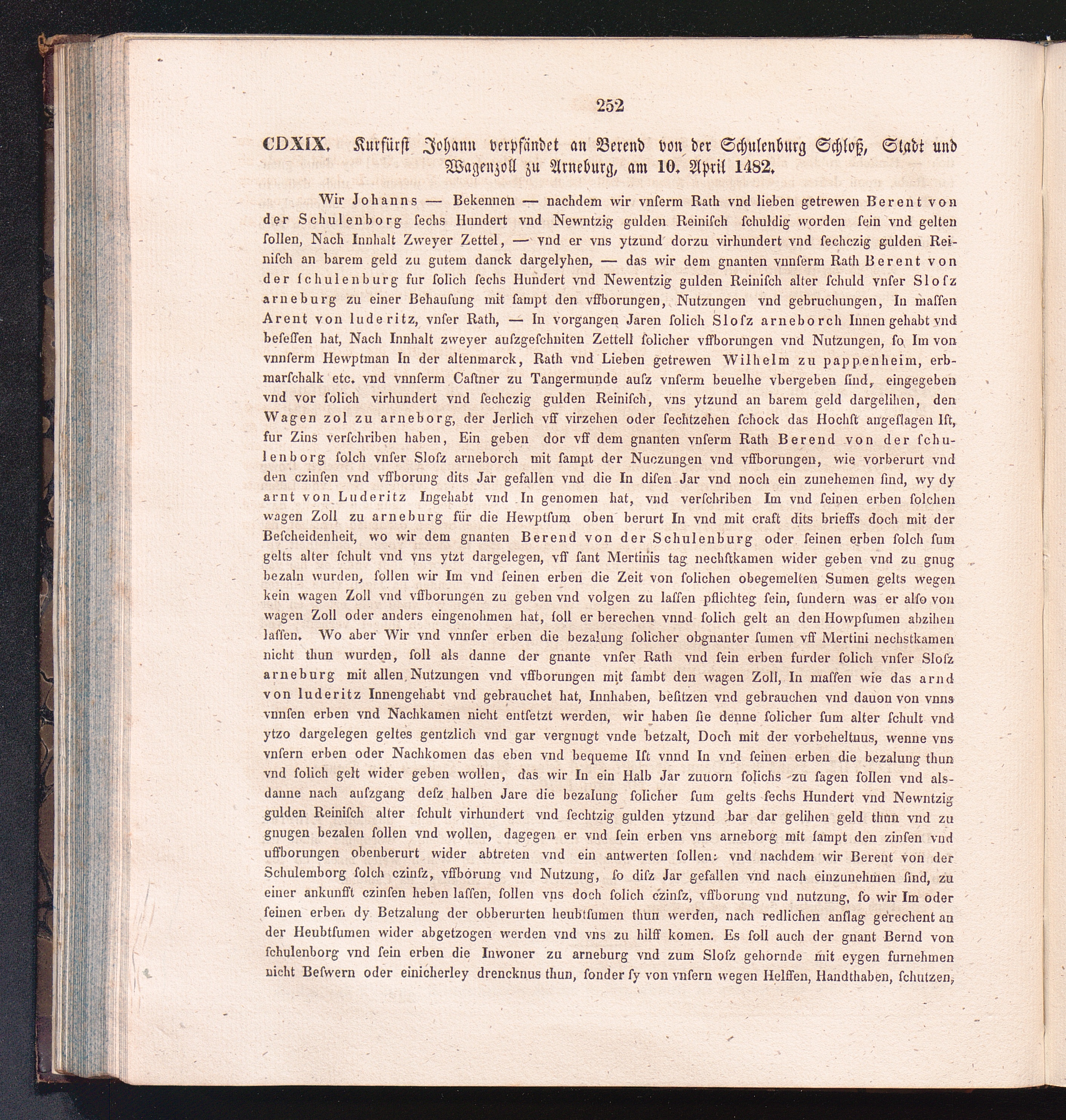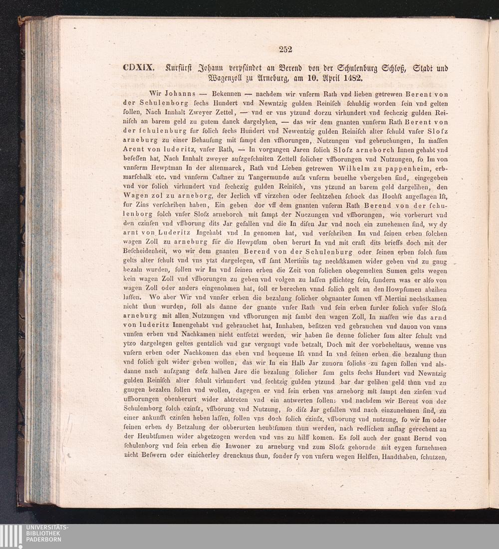 CDXIX. Kurfürst Johann verpfändet an Berend von der Schulenburg Schloß, Stadt und[...]