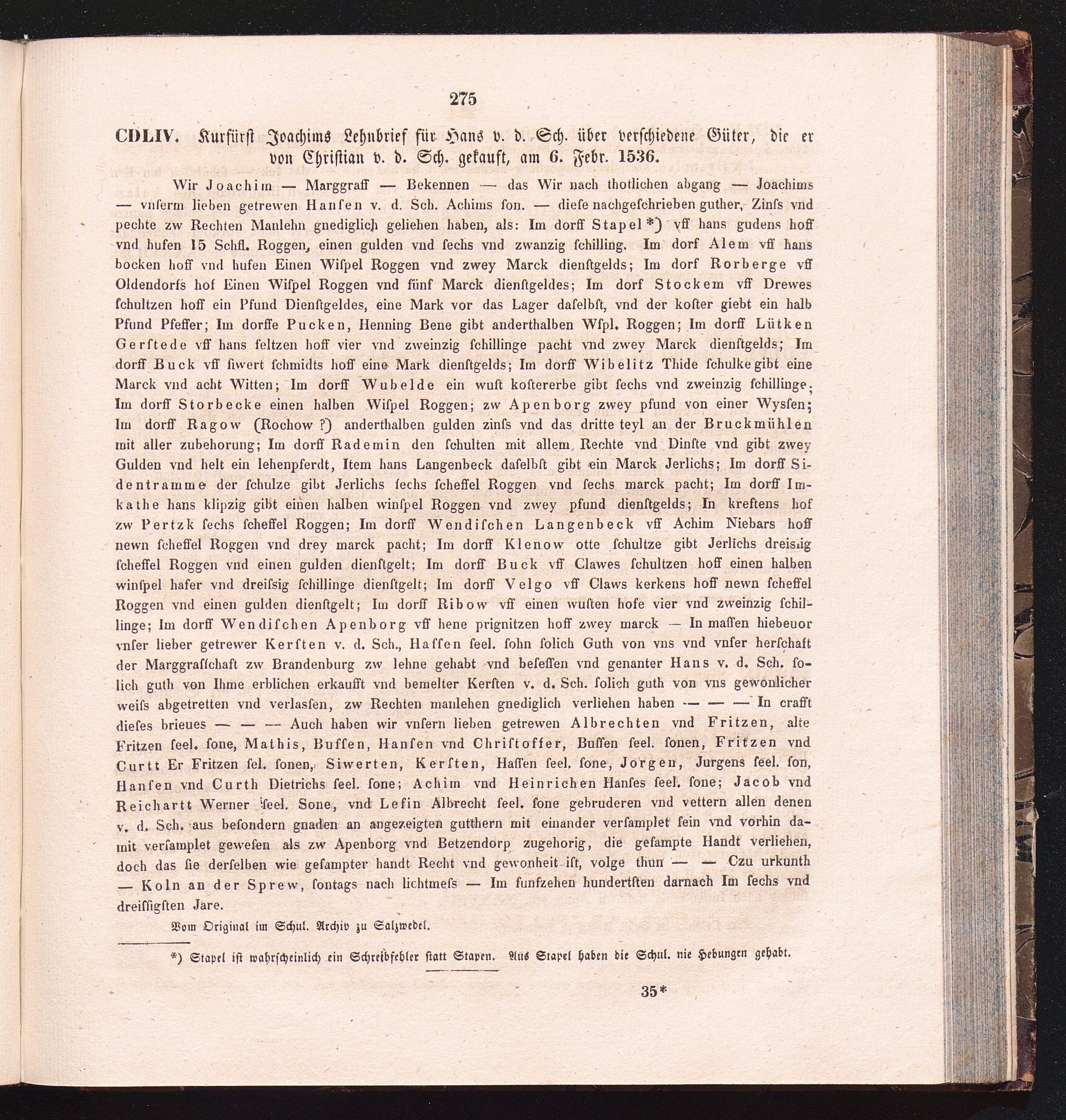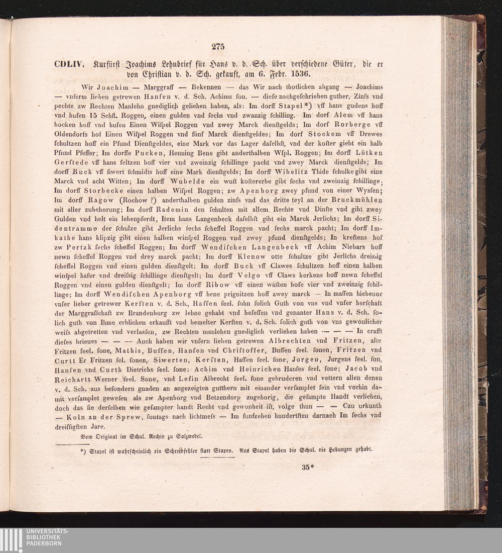 CDLIV. Kurfürst Joachims Lehnbrief für Hans v. d. Sch. über verschiedene Güter, die[...]