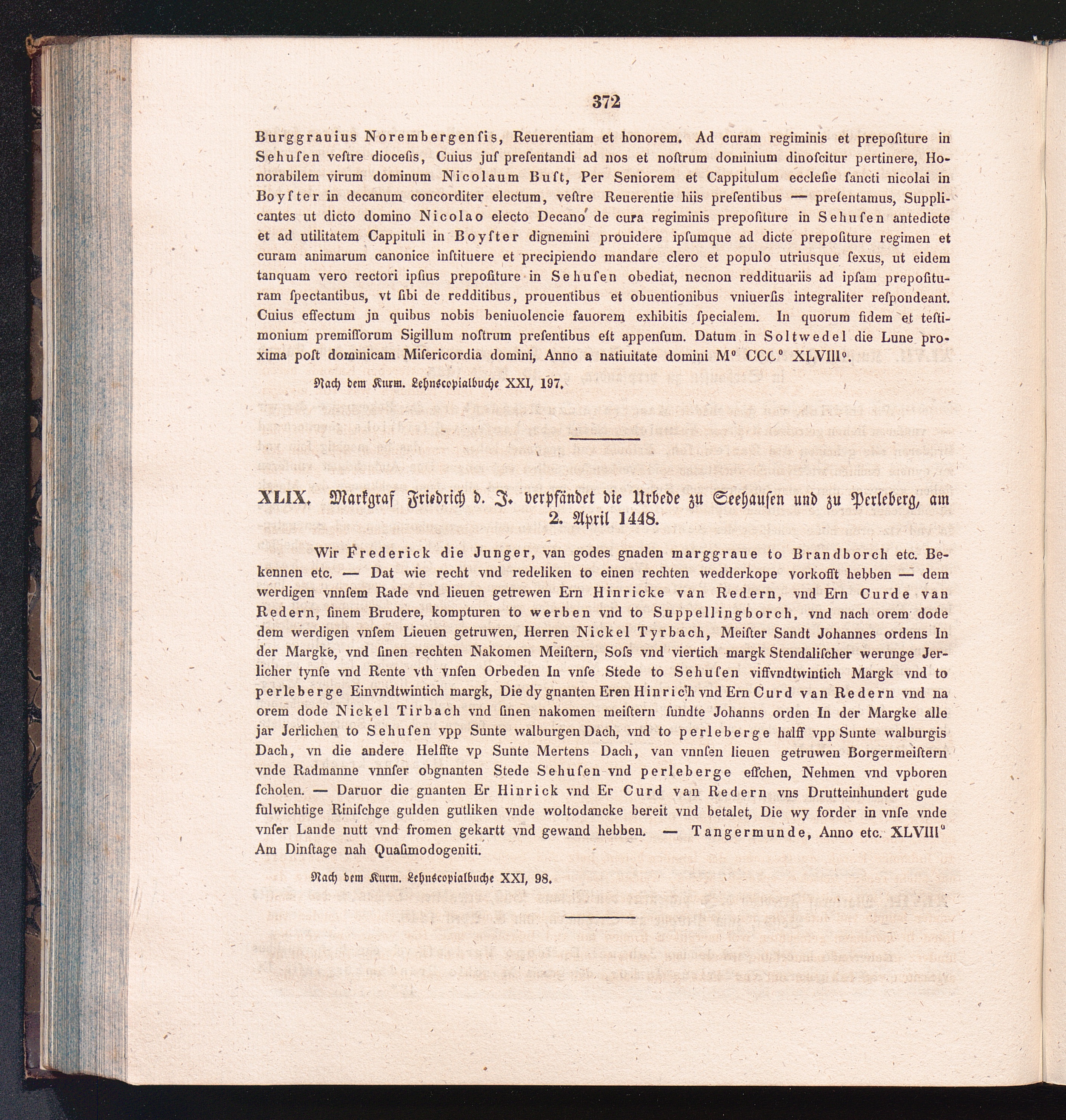 XLIX. Markgraf Friedrich d. J. verpfändet die Urbede zu Seehausen und zu Perleberg,[...]