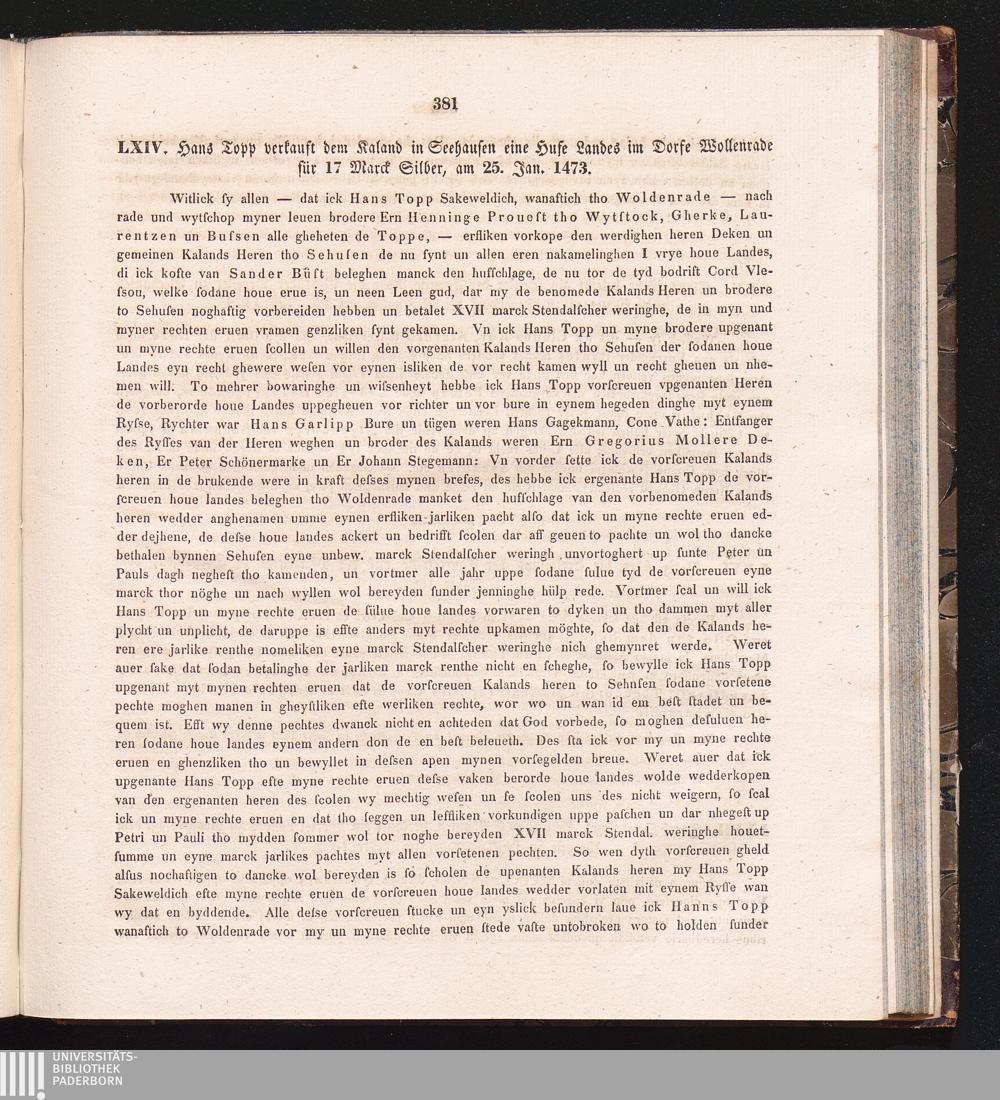 LXIV. Hans Topp verkauft dem Kaland in Seehausen eine Hufe Landes im Dorfe Wollenrade[...]
