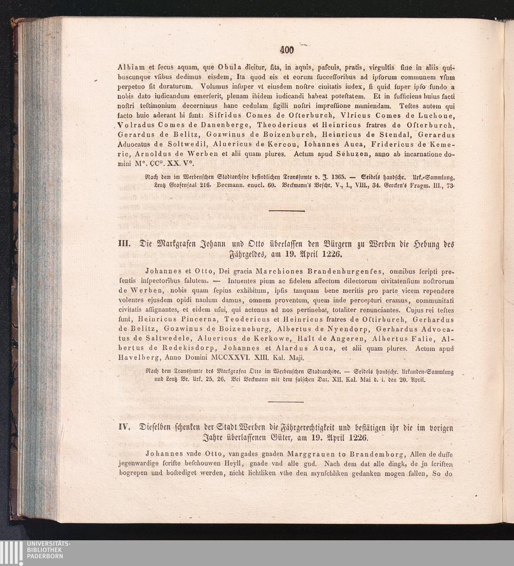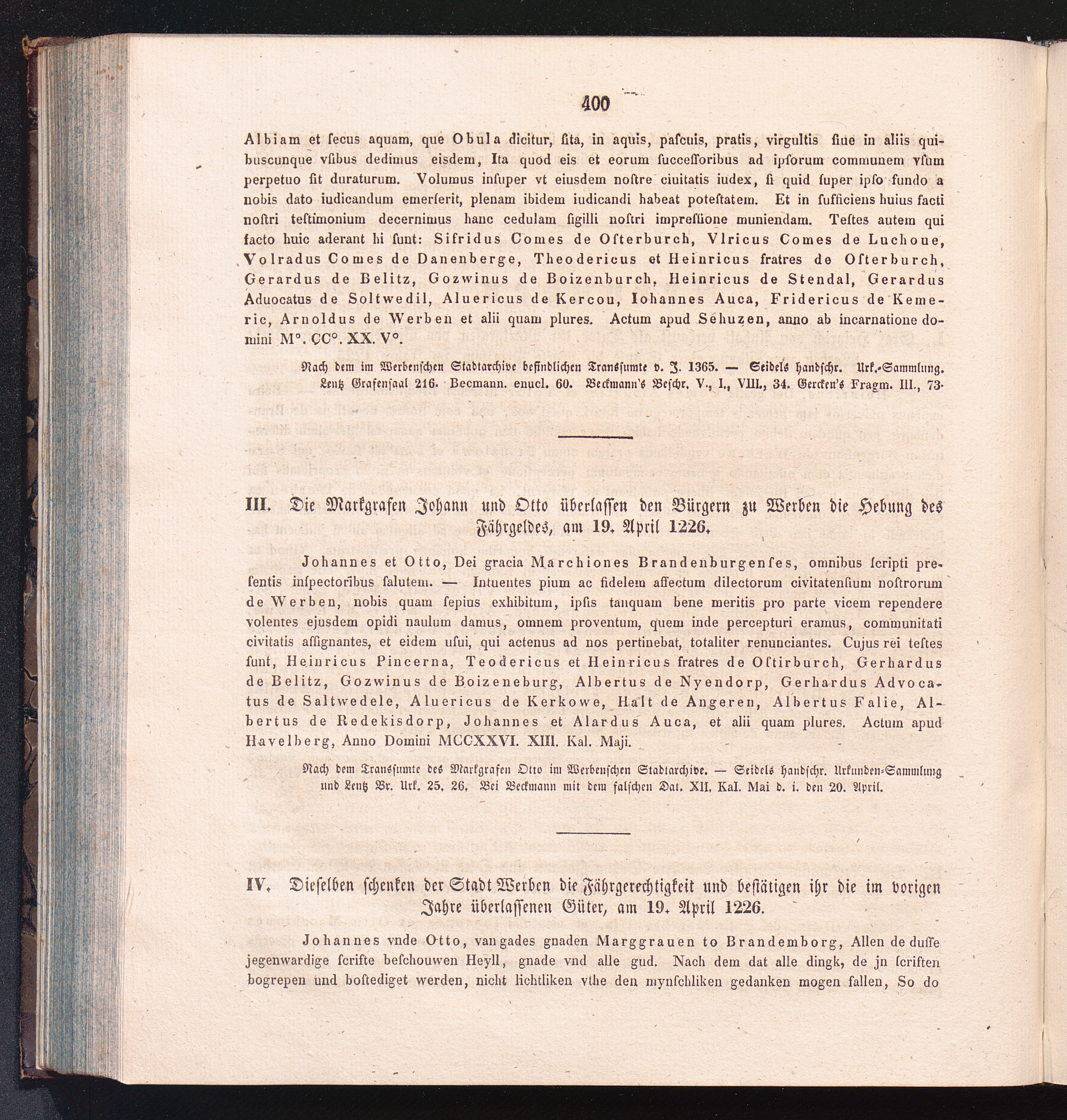 IV. Dieselben schenken der Stadt Werben die Fährgerechtigkeit und bestätigen ihr[...]
