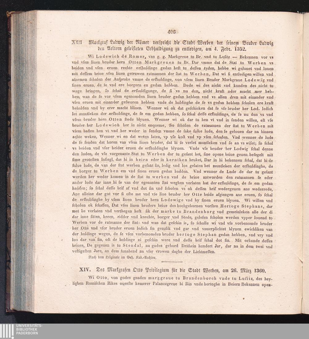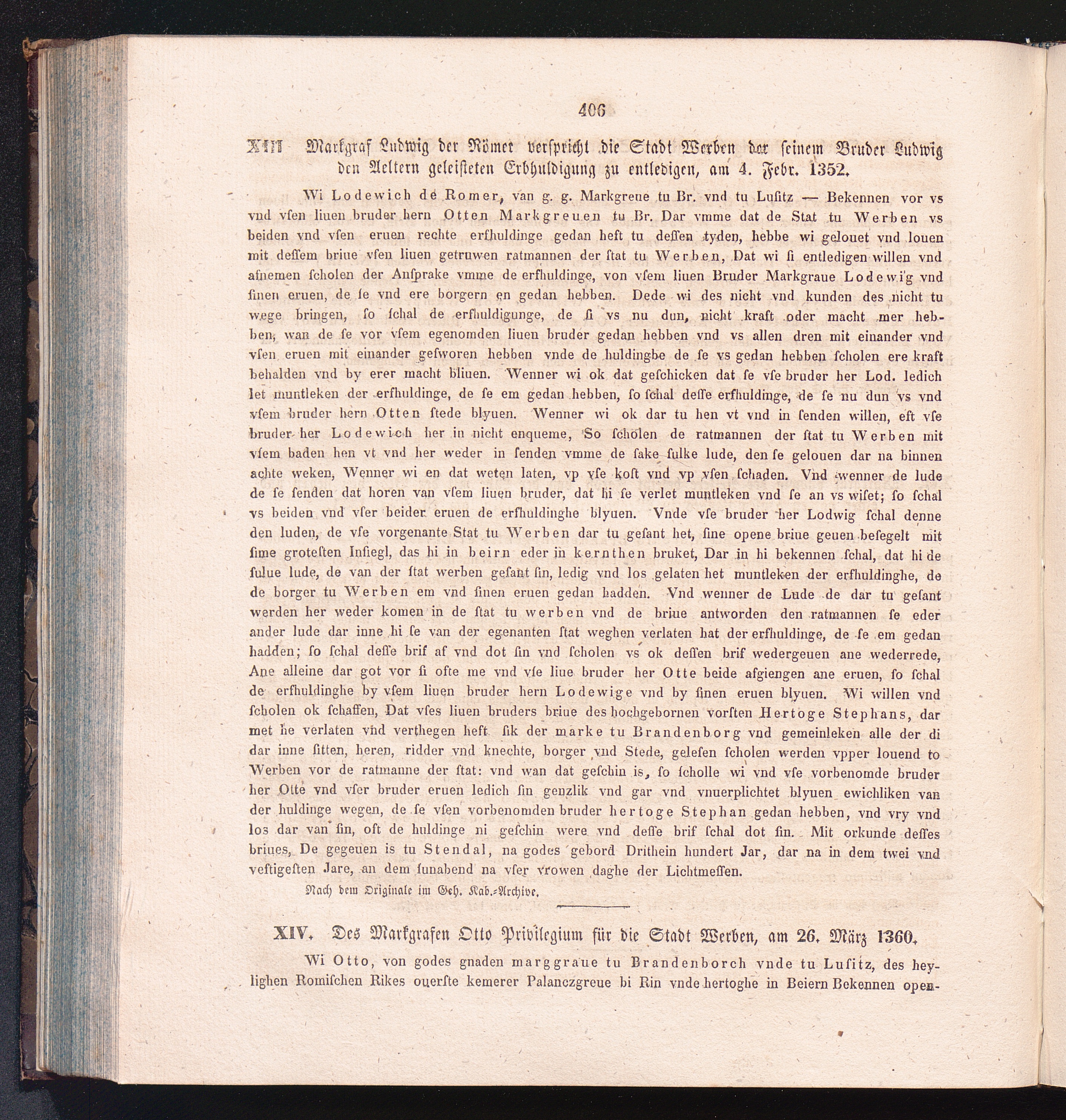 XIV. Des Markgrafen Otto Privilegium für die Stadt Werben, am 26. März 1360.
