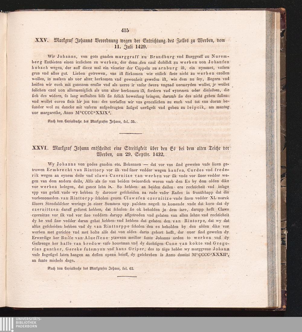 XXVI. Markgraf Johann entscheidet eine Streitigkeit über den Cs bei dem alten Teiche[...]